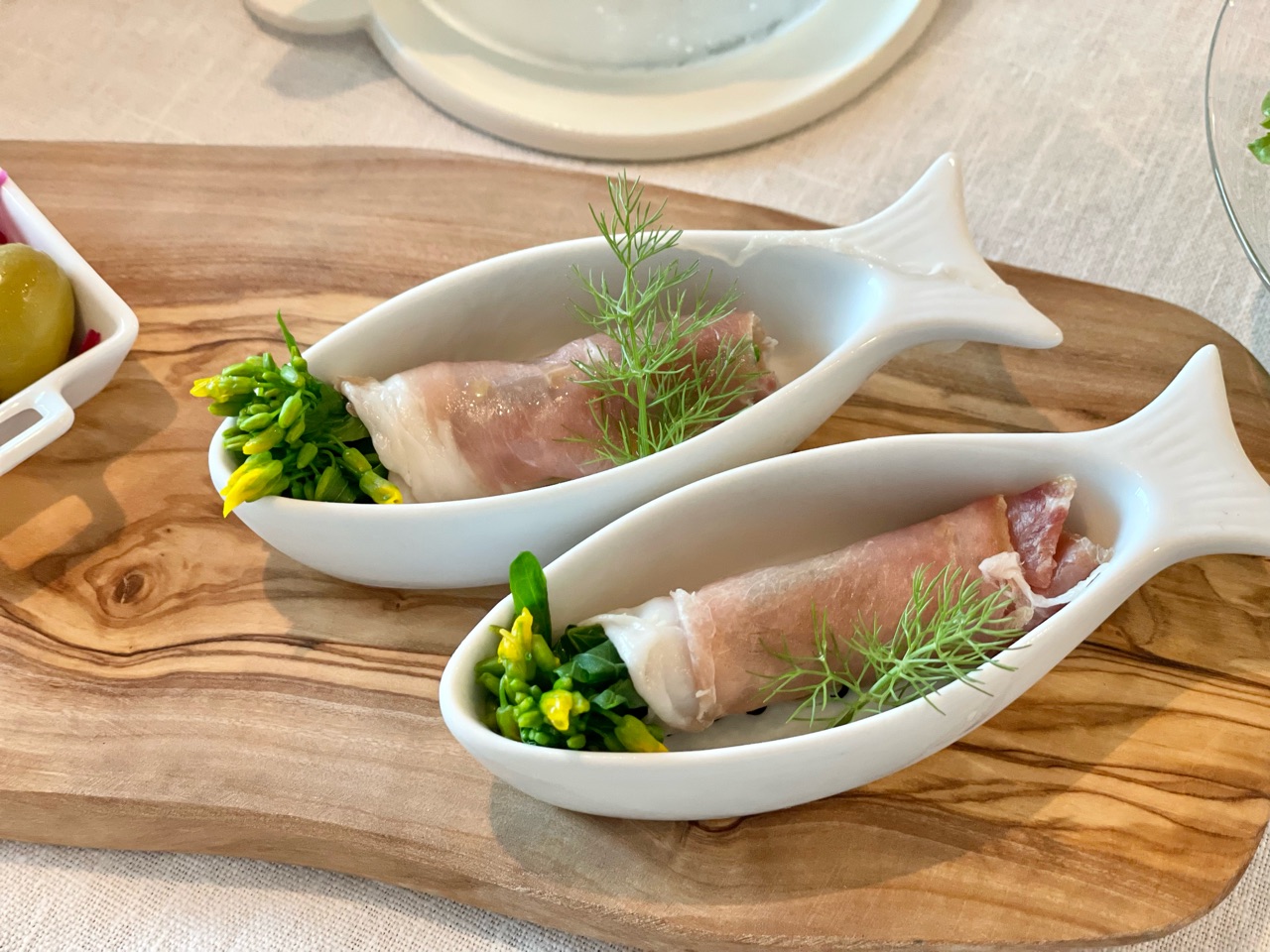 菜の花を茹でて生ハムで巻いてオリーブオイルをかけたもの