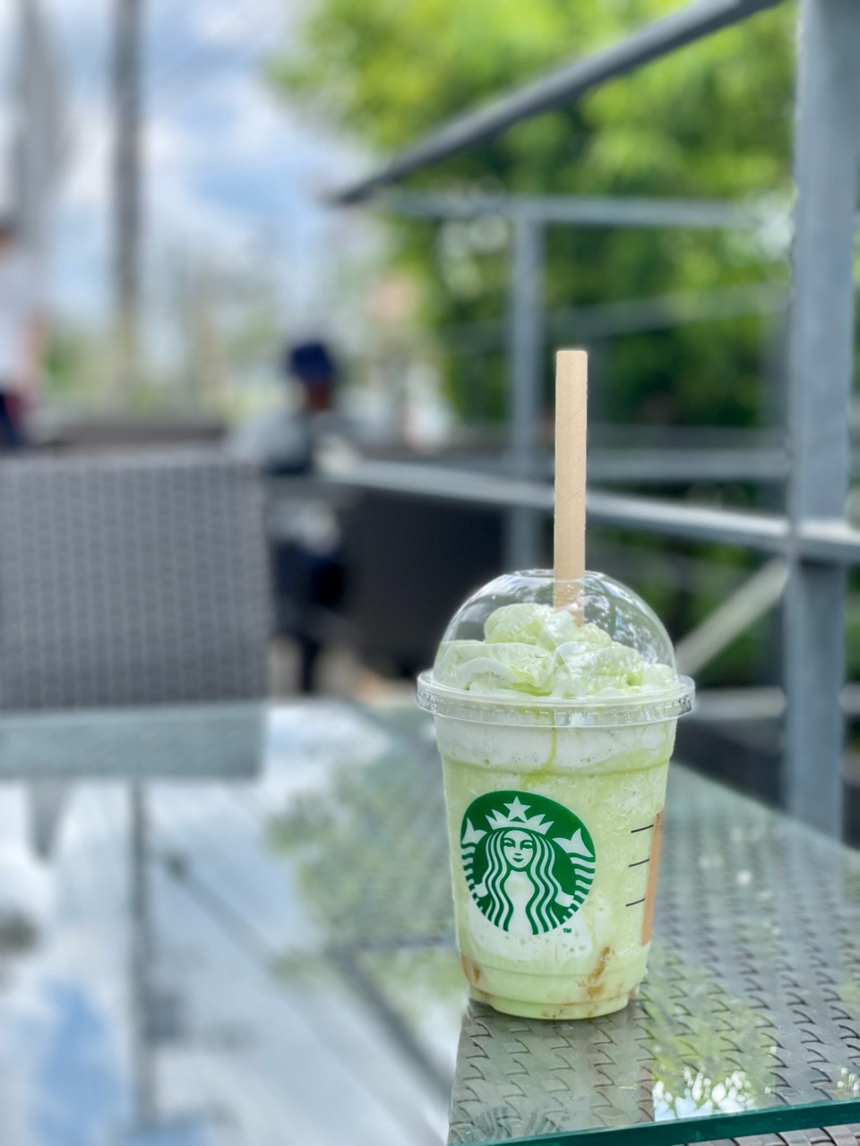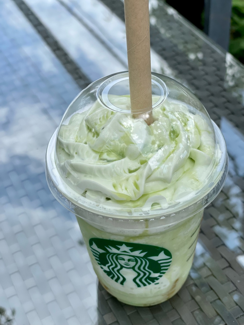 青空の下で飲むメロンのフラペチーノ、とっても美味しかったです✨