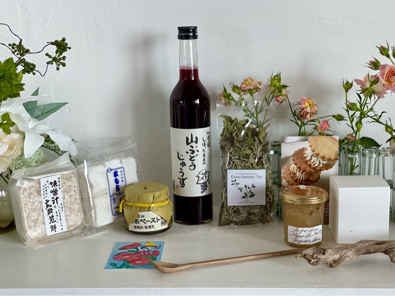 こちらは、林農園の山ぶどうジュースや、栗のペースト、お味噌汁に入れることもできる玄米せんべいや、氷もち。