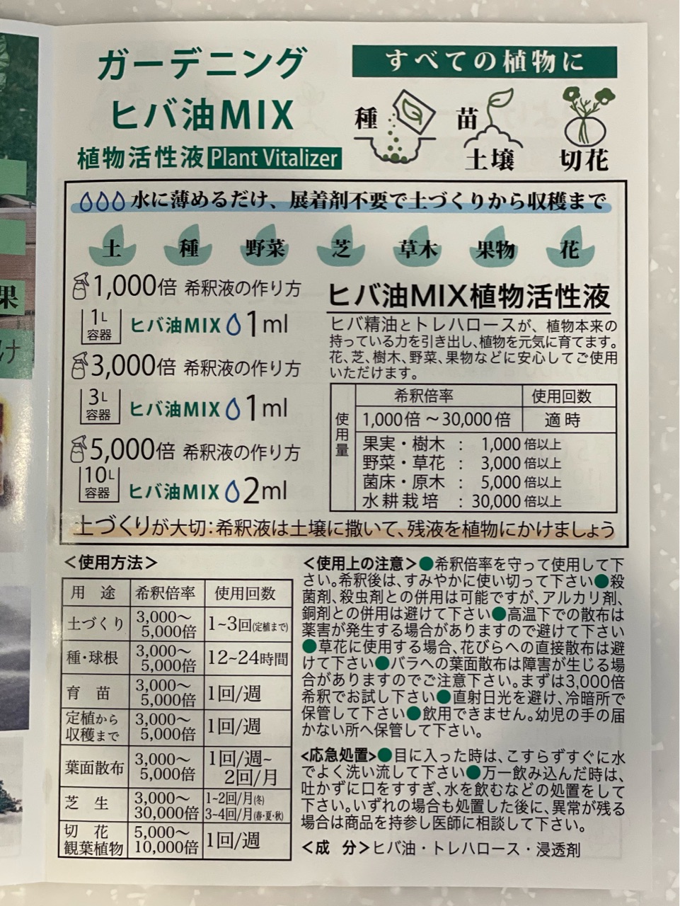 植物活性液のヒバ油MIXは緑の文字。