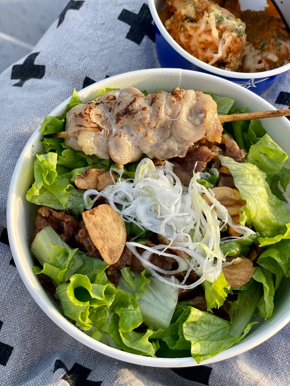 こちらは、山崎康晃選手プロデュースの「ヤスアキのスタミナ丼」の上に、濱口遥大選手プロデュースの「せせり串」を乗っけました。
