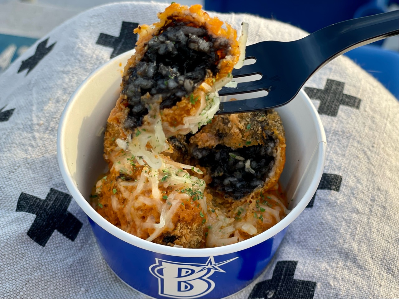 中に、イカ墨カラーのコロッケが入ってた?
