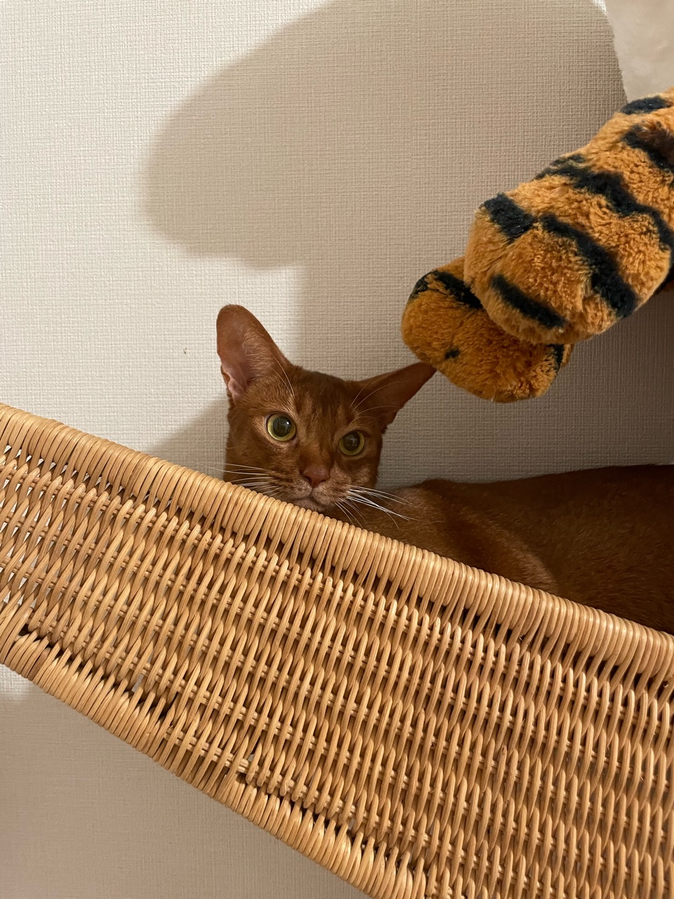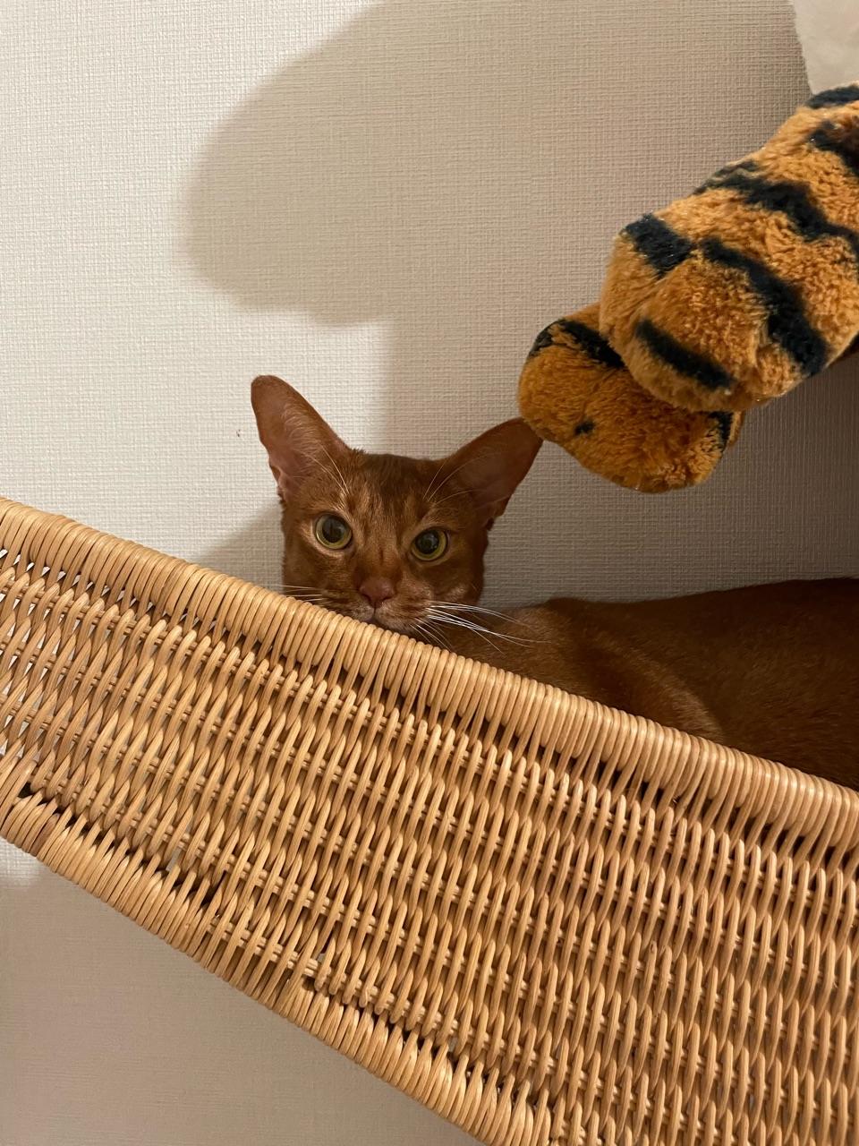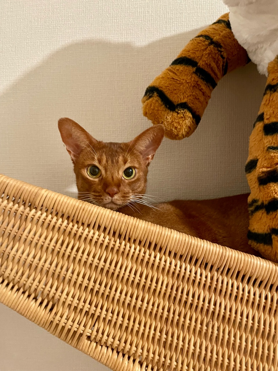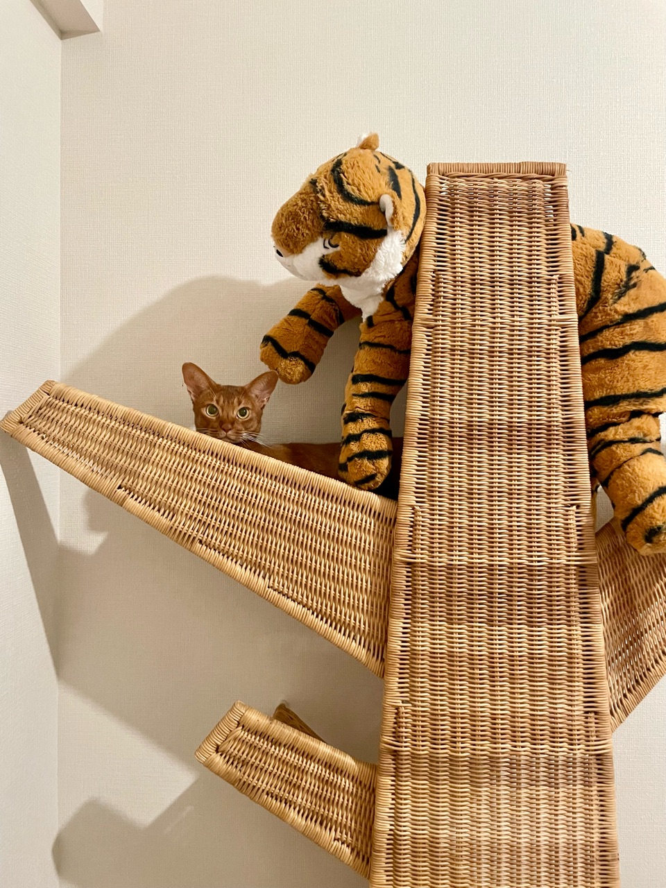 IKEAの巨大爪研ぎ(再販してほしいアイテム)で、トラさんと一緒にくつろいでるひめちゃん。