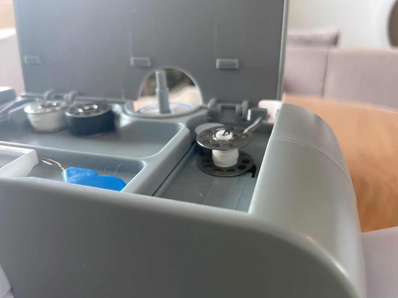 ミシン本体の上部の蓋をあけると、ボビンの糸巻き機能と収納ケースがありました。