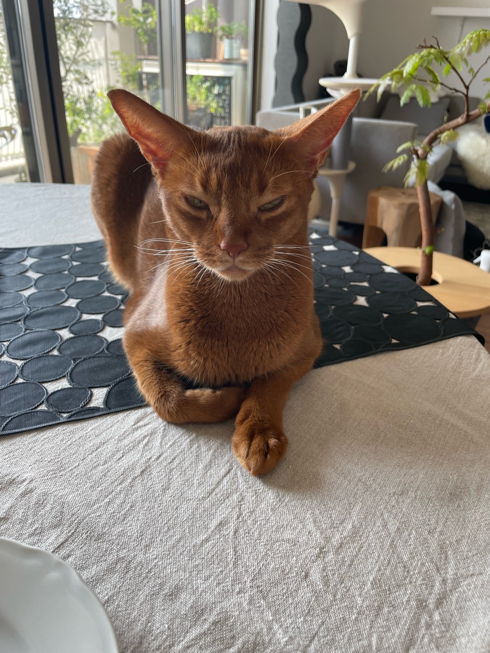ヴォーノは人間の食事には興味無し。でもダイニングの椅子は自分の物だと思ってるみたいで椅子取りゲームには参加してます😓