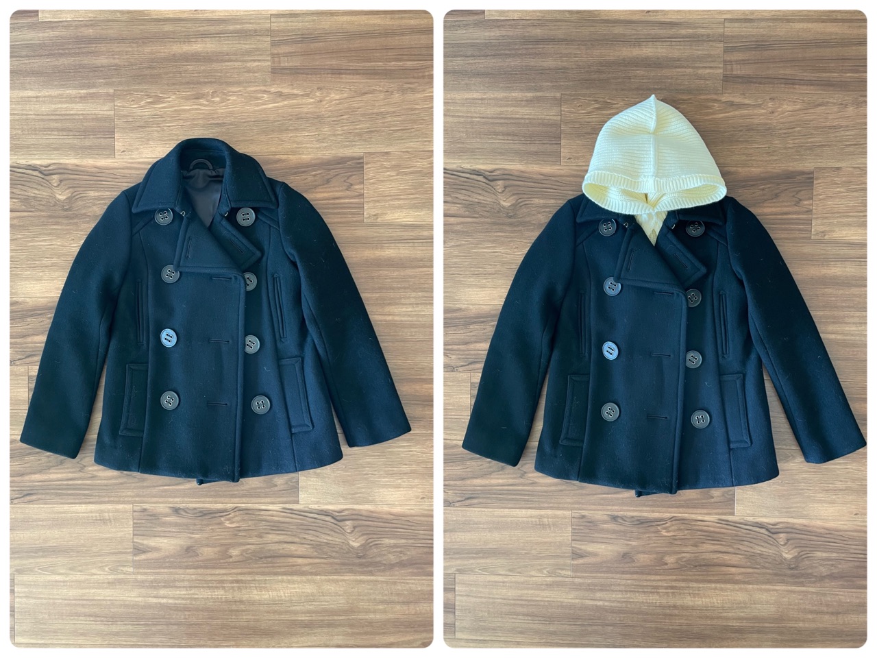 同じような素材のニットに合わせたら、自然な感じでフード付きのニットみたいにもなる♪