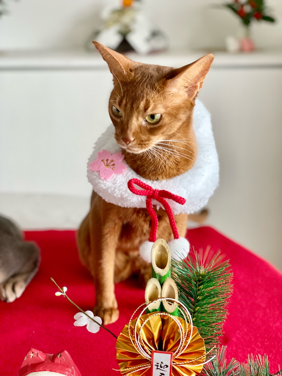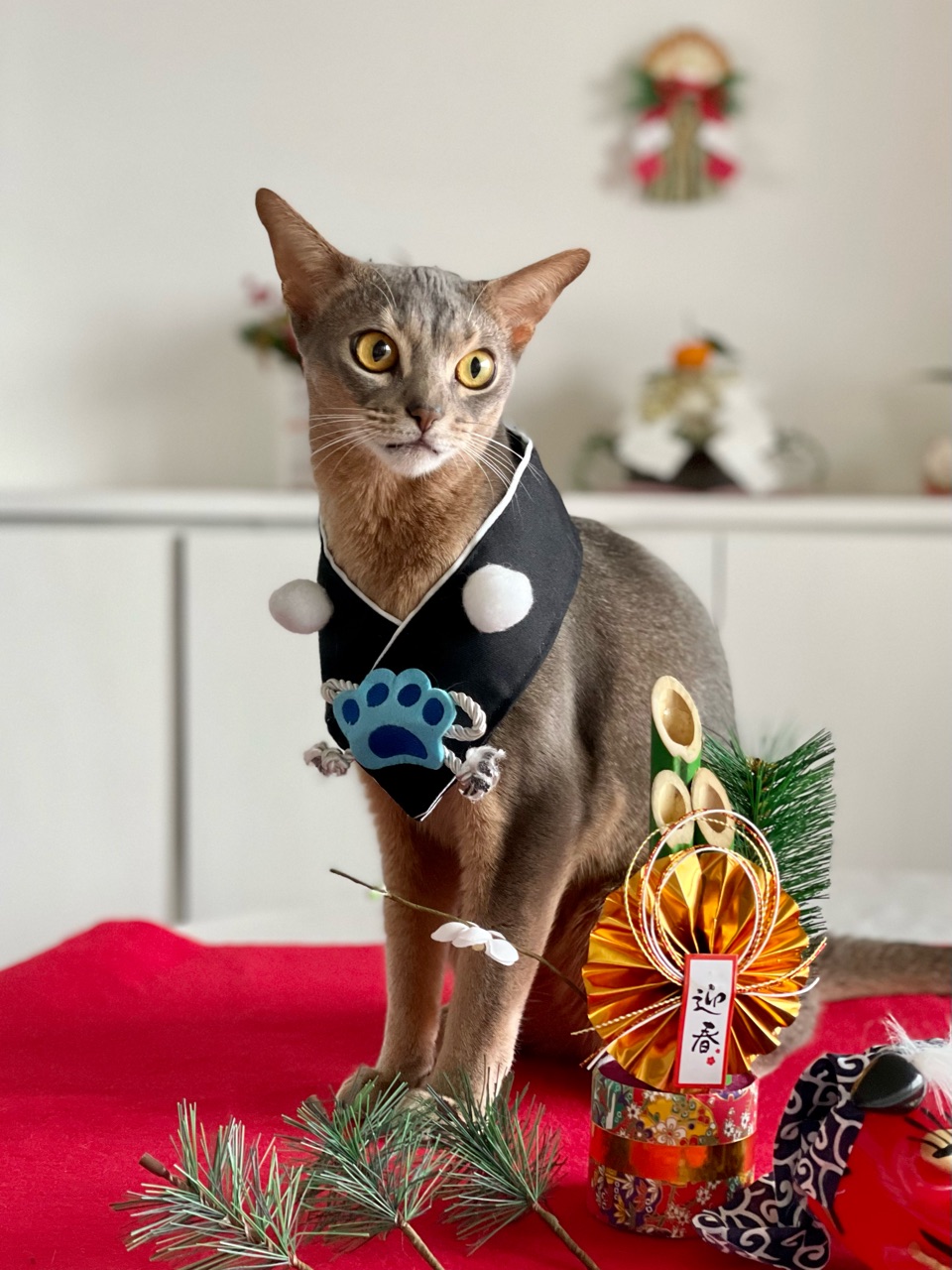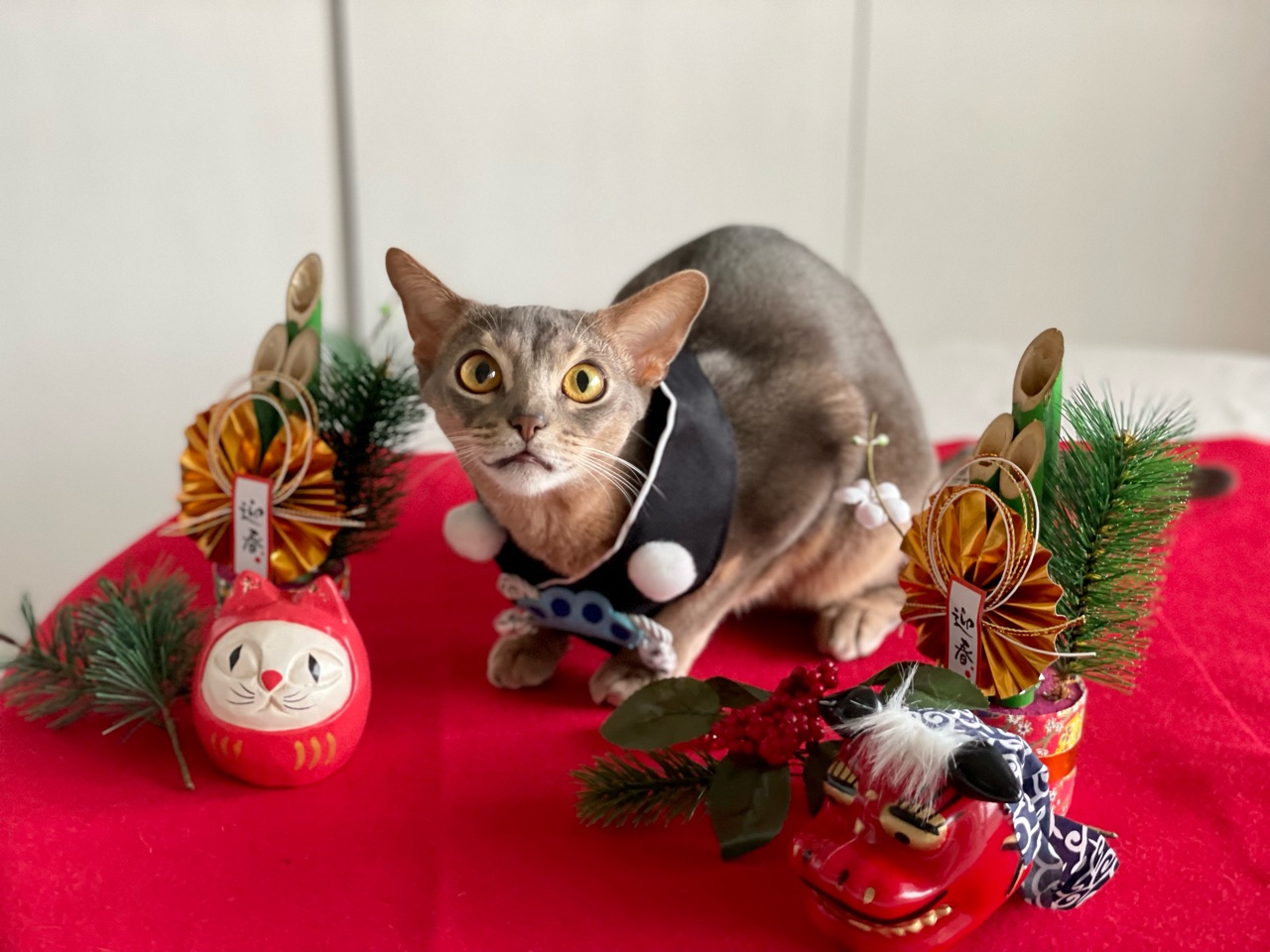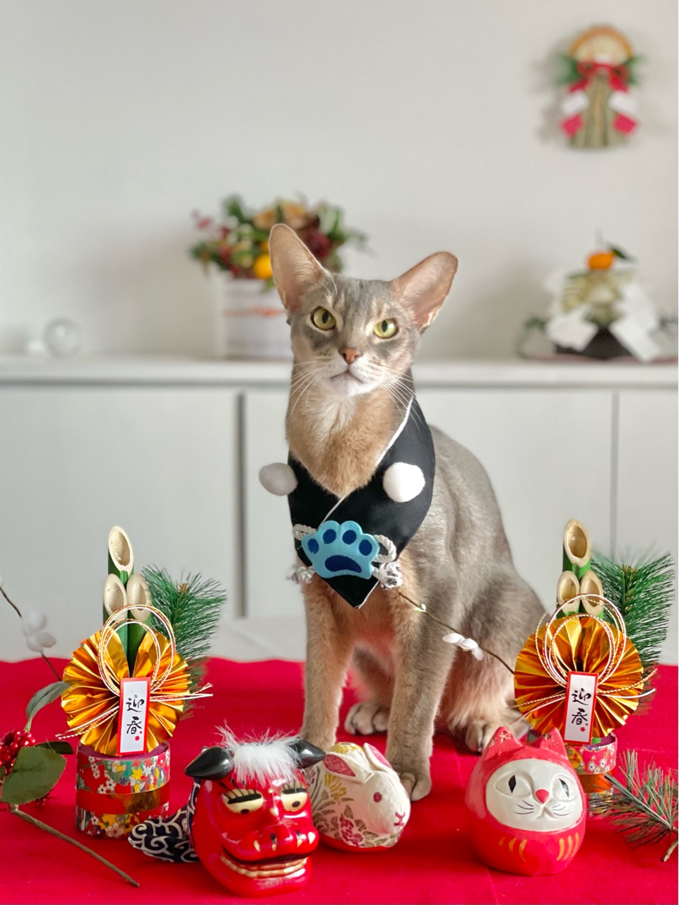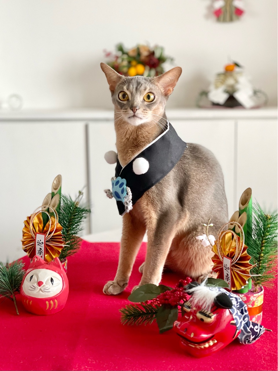 今回は、撮れるかどうかわからないなぁと思いつつ会場作りをしていると、わか坊が遊びに来たのでお正月の襟をかけてみたら…