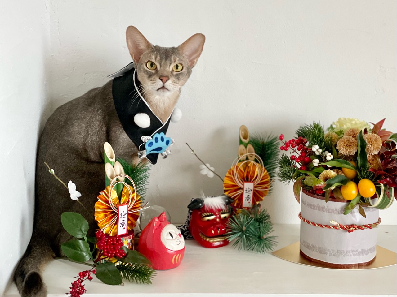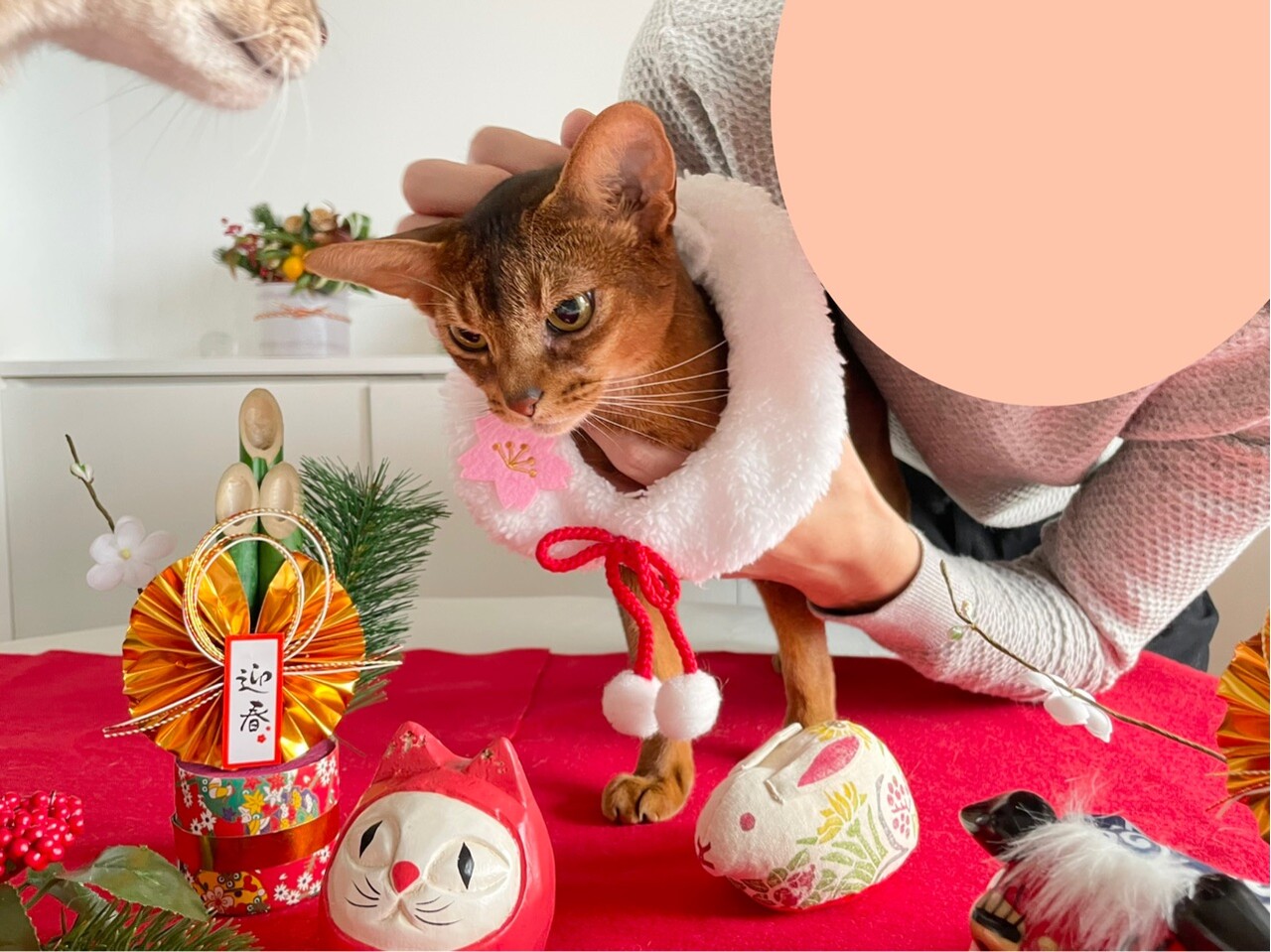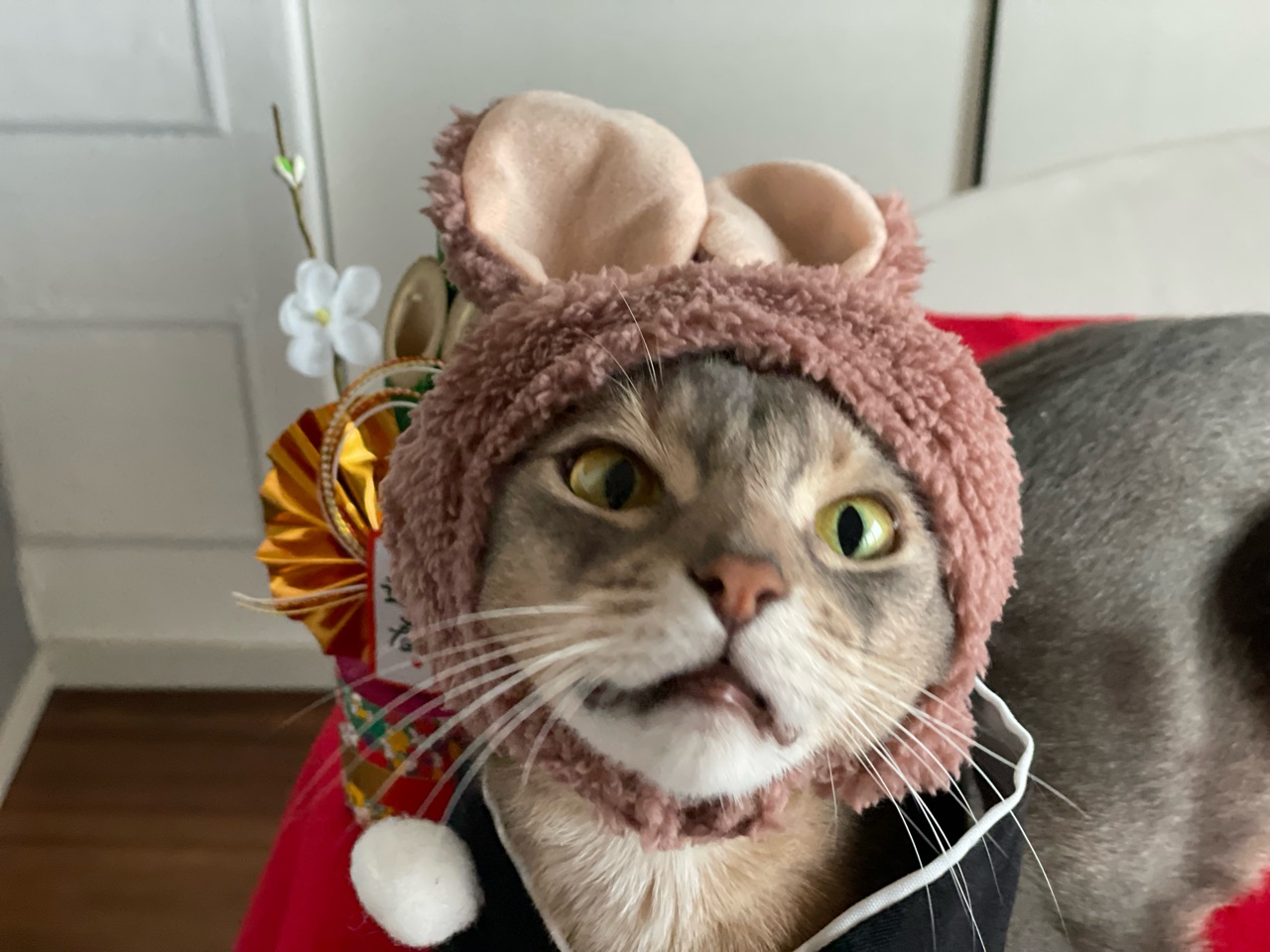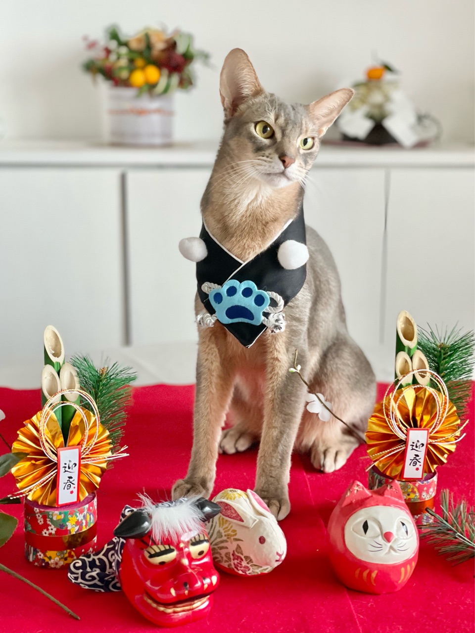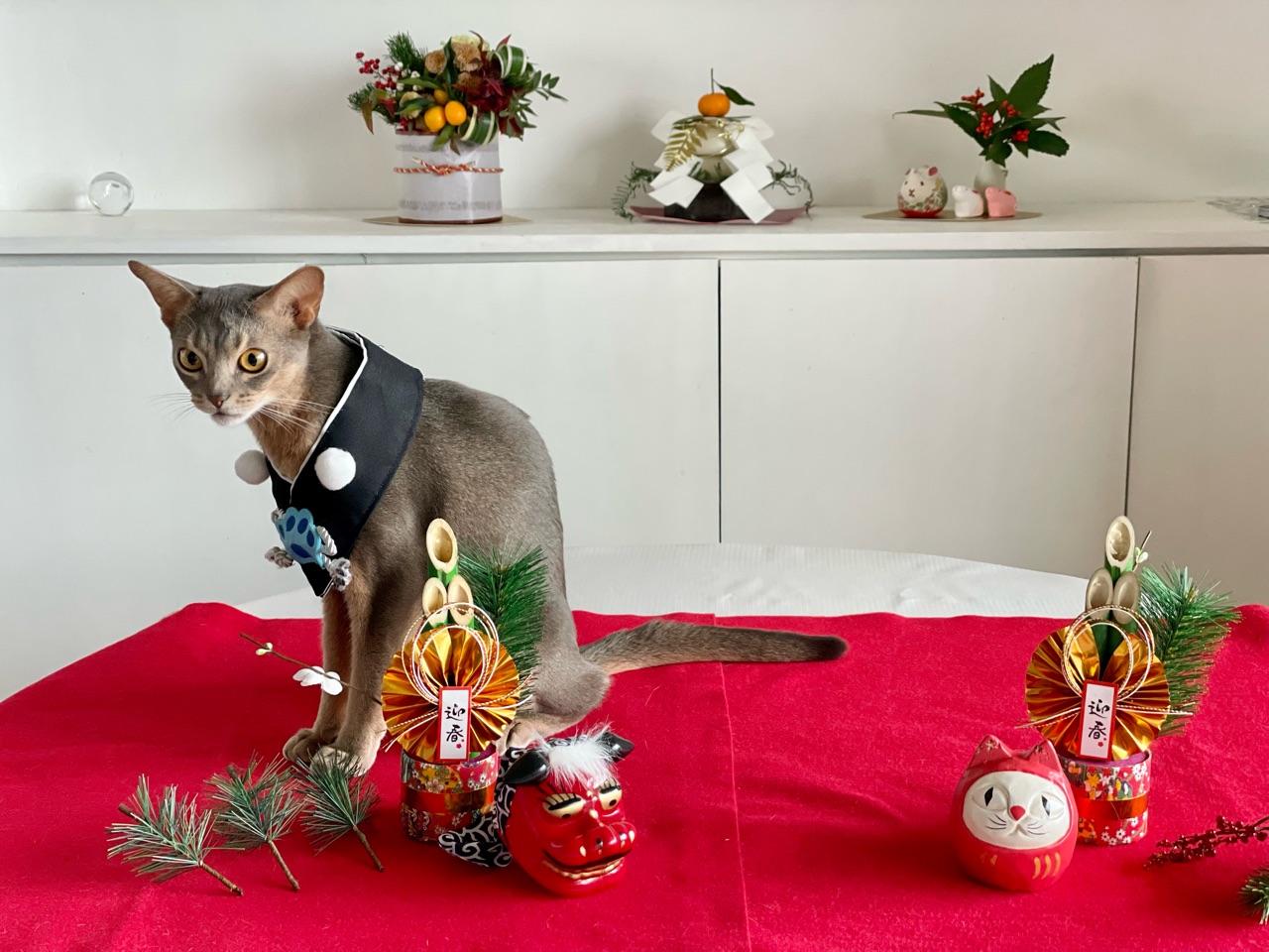 今回は、撮れるかどうかわからないなぁと思いつつ会場作りをしていると、わか坊が遊びに来たのでお正月の襟をかけてみたら…