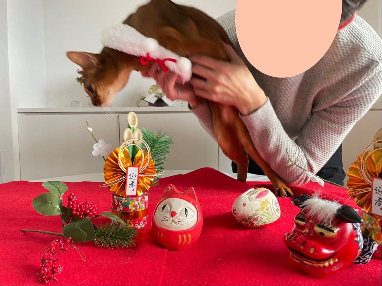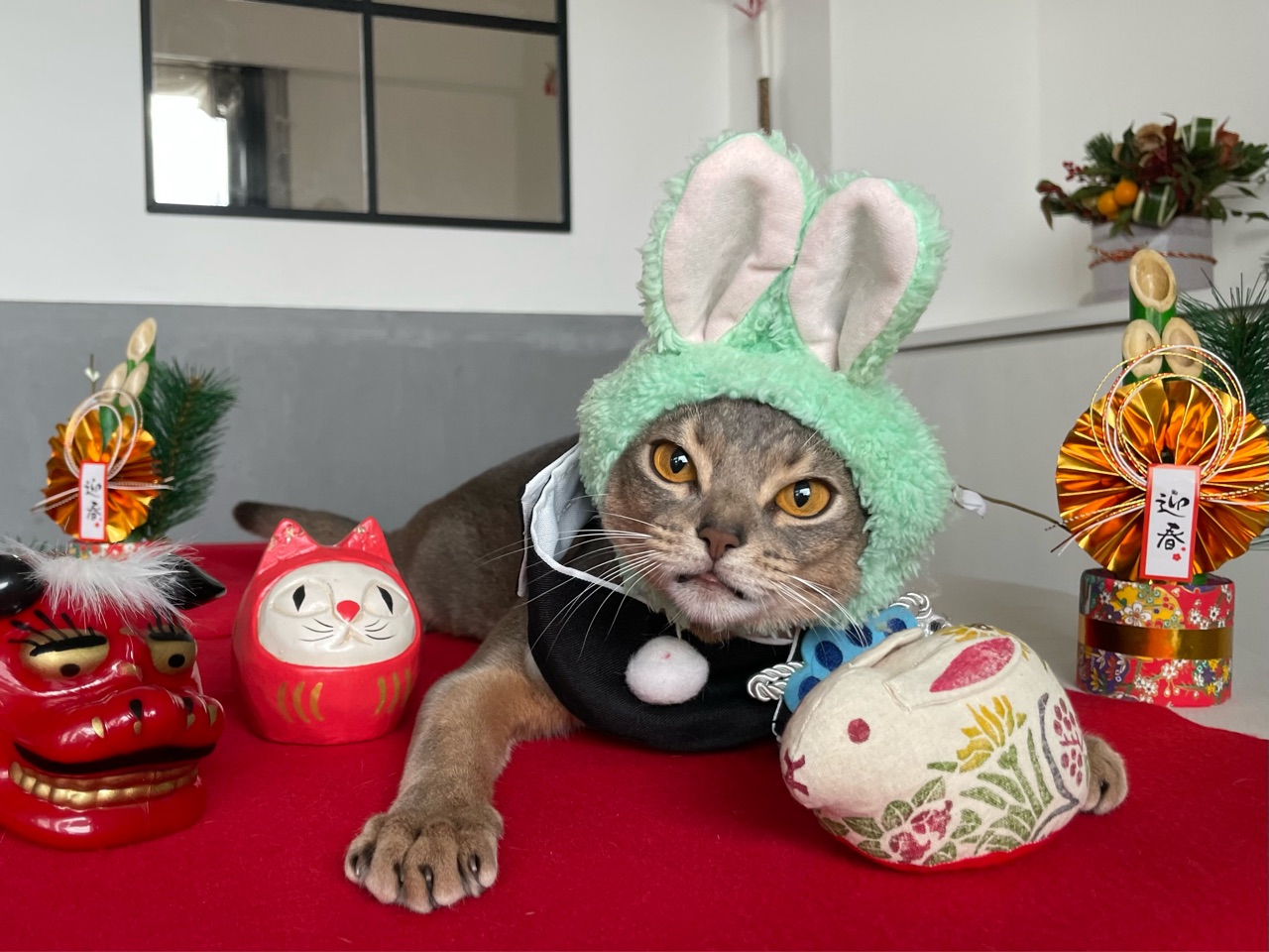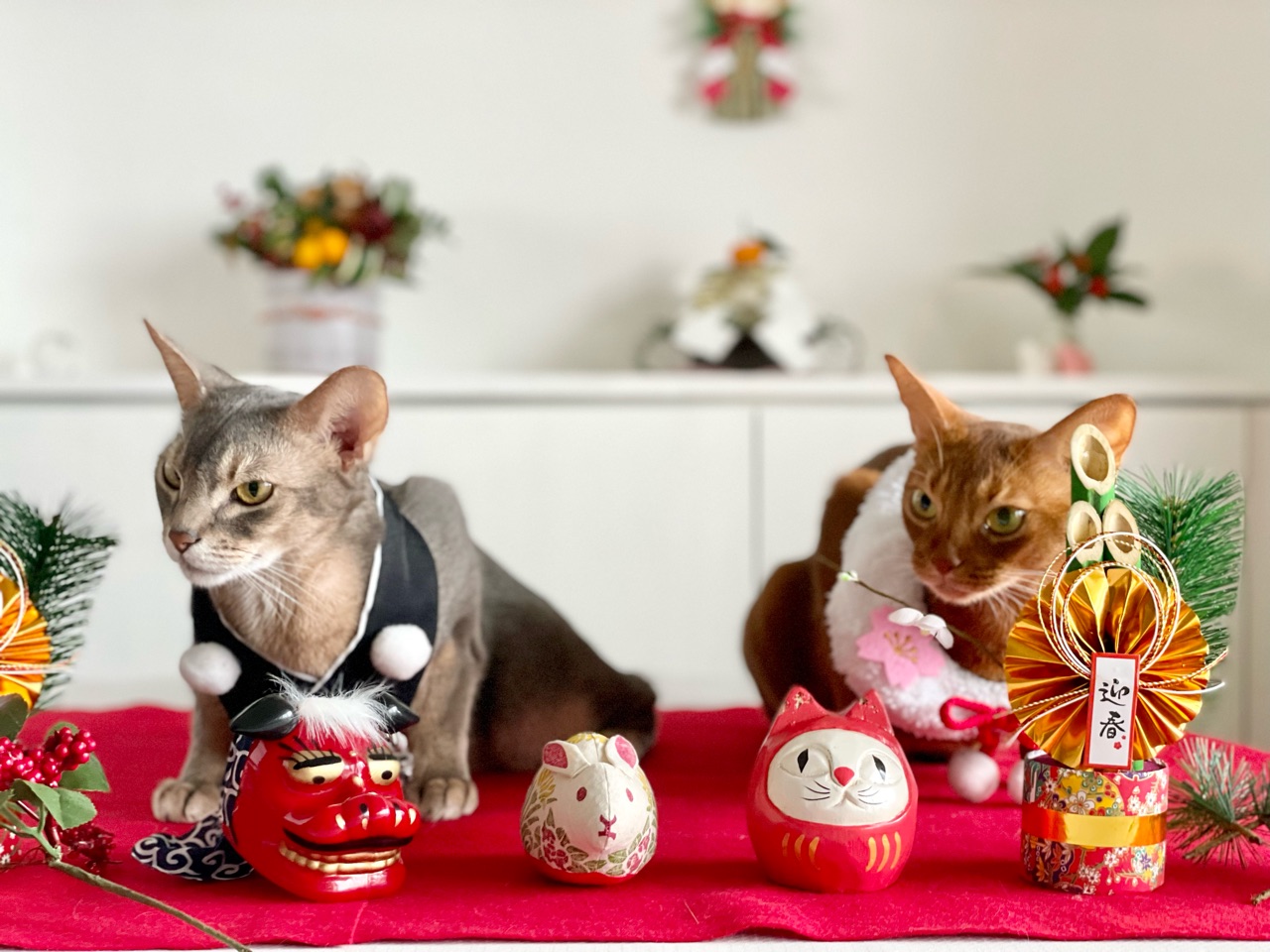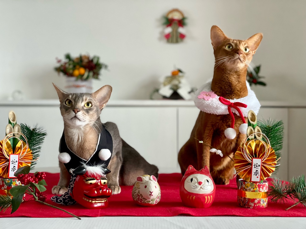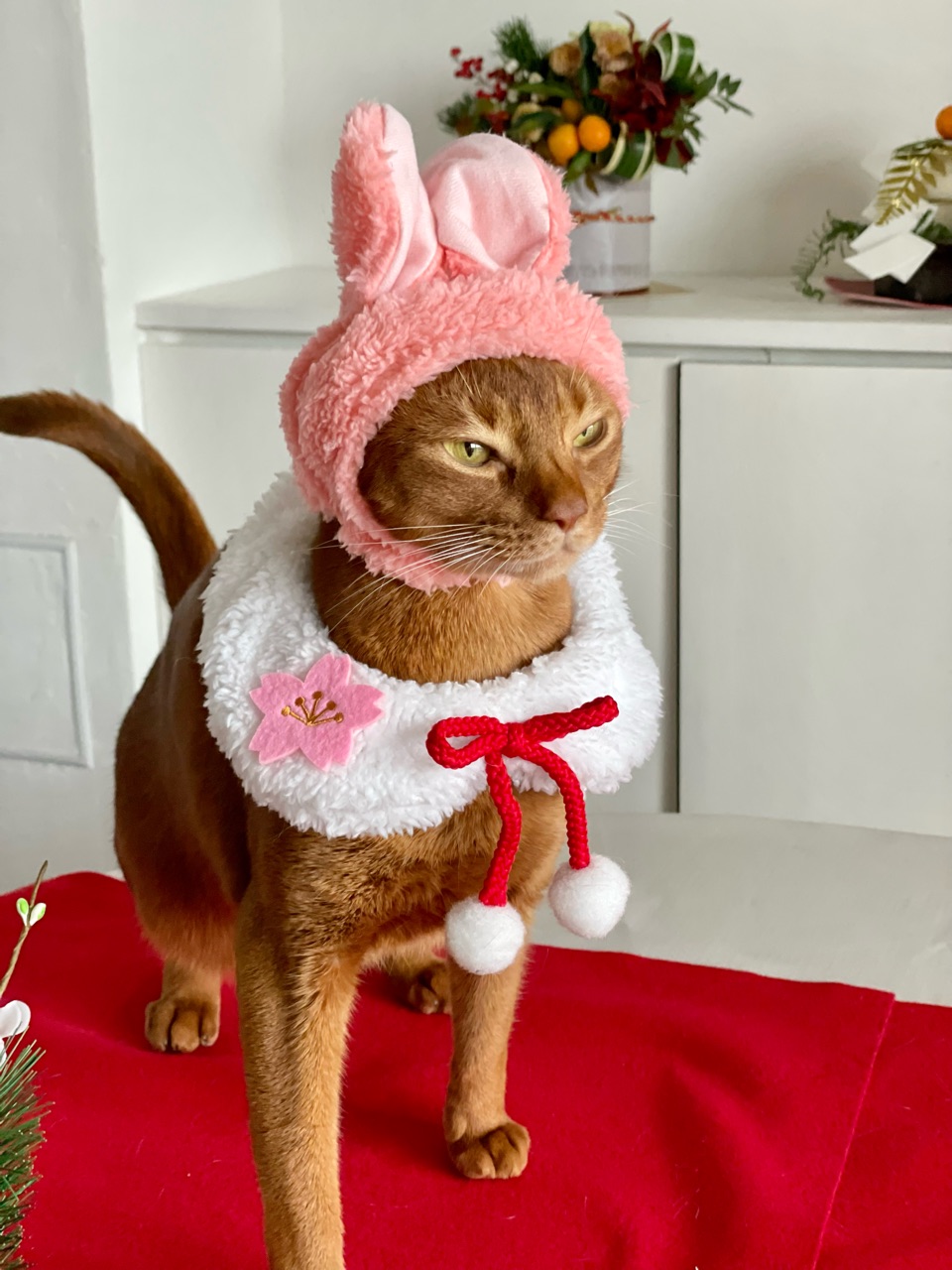 今回は、撮れるかどうかわからないなぁと思いつつ会場作りをしていると、わか坊が遊びに来たのでお正月の襟をかけてみたら…
