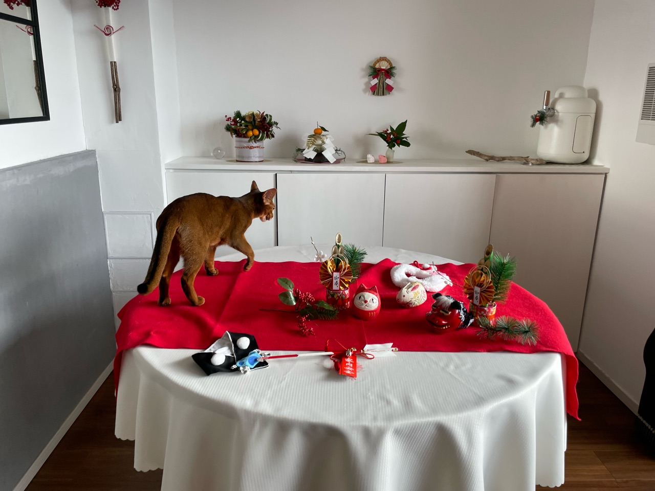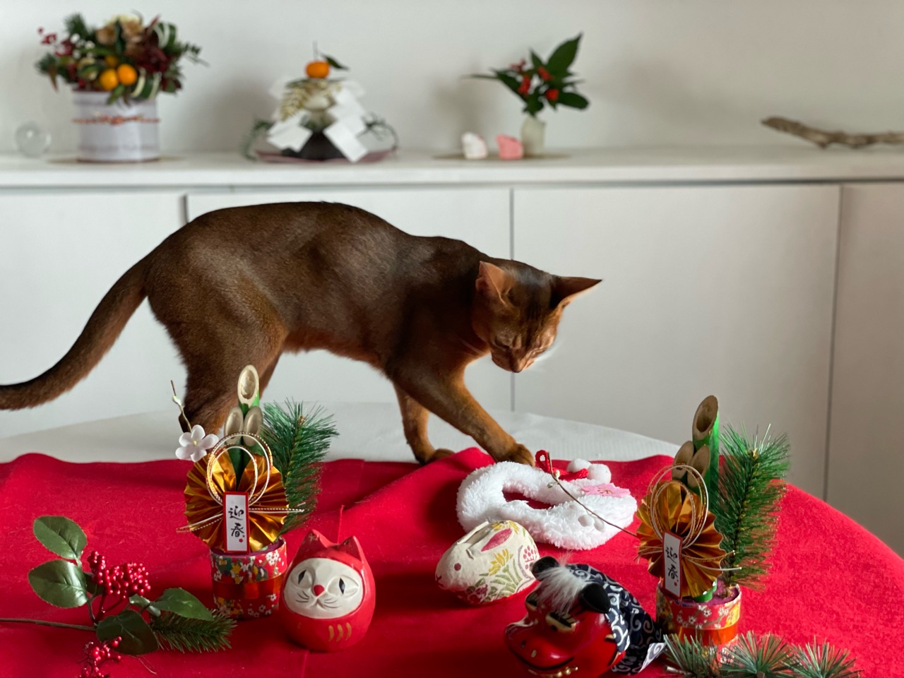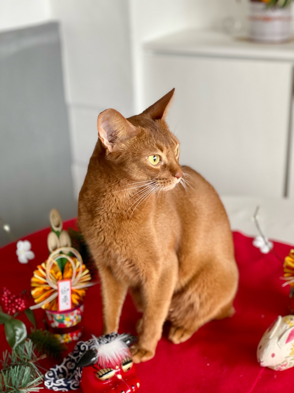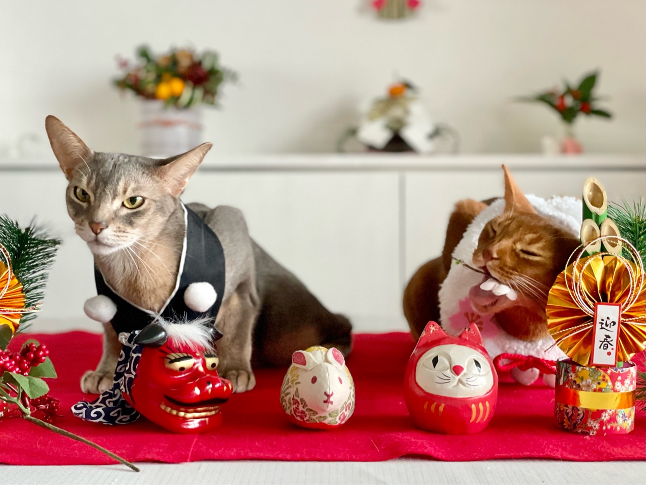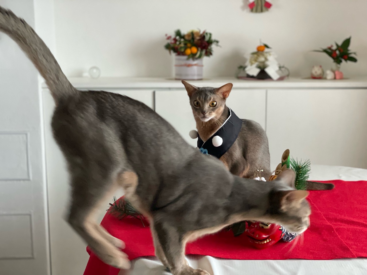 今回は、撮れるかどうかわからないなぁと思いつつ会場作りをしていると、わか坊が遊びに来たのでお正月の襟をかけてみたら…