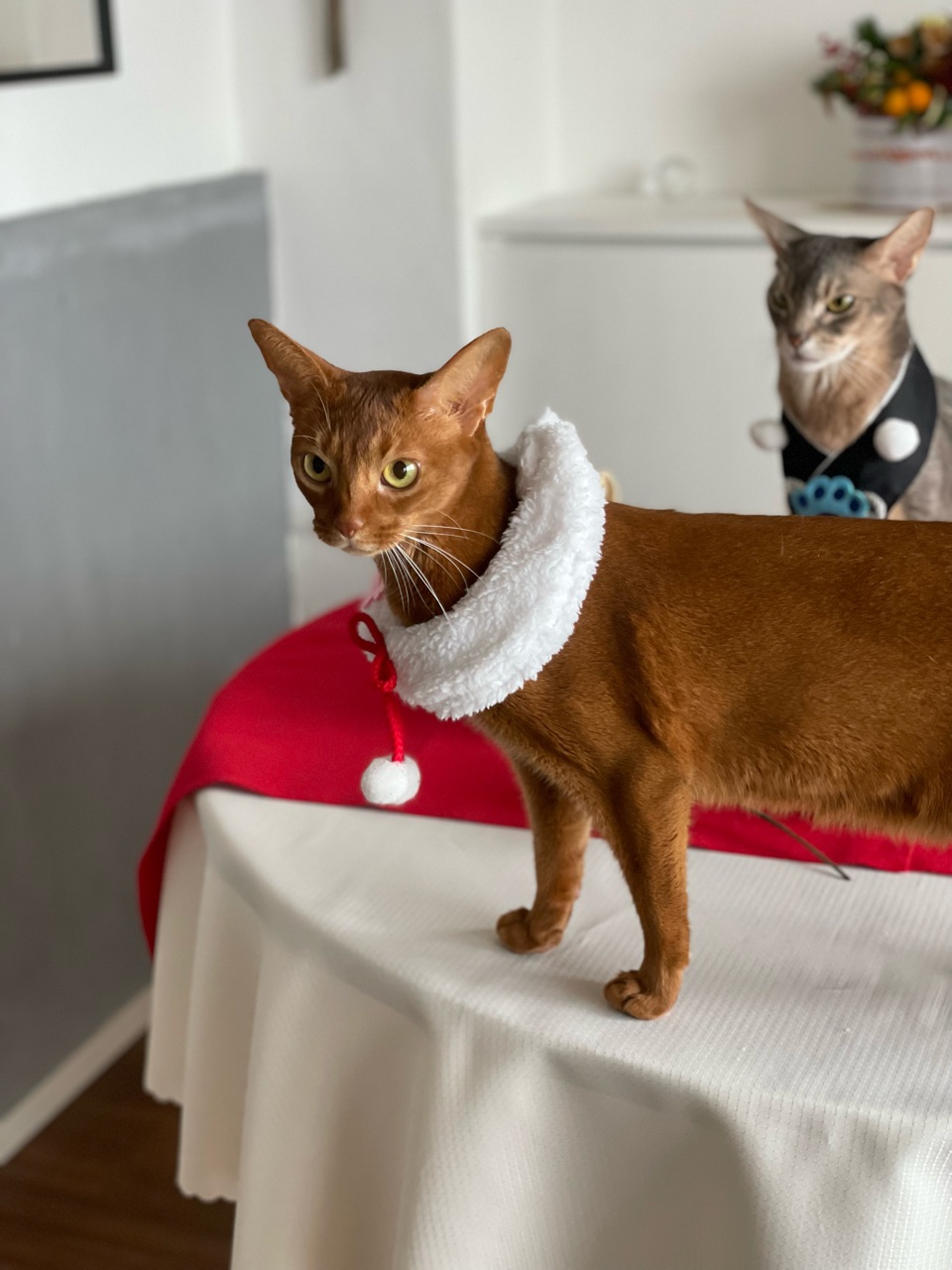 そのまま、テーブルに作った撮影所に移動してきたところで、今度はひめちゃんが近くに来たので乗せてみて、襟をかけたら…