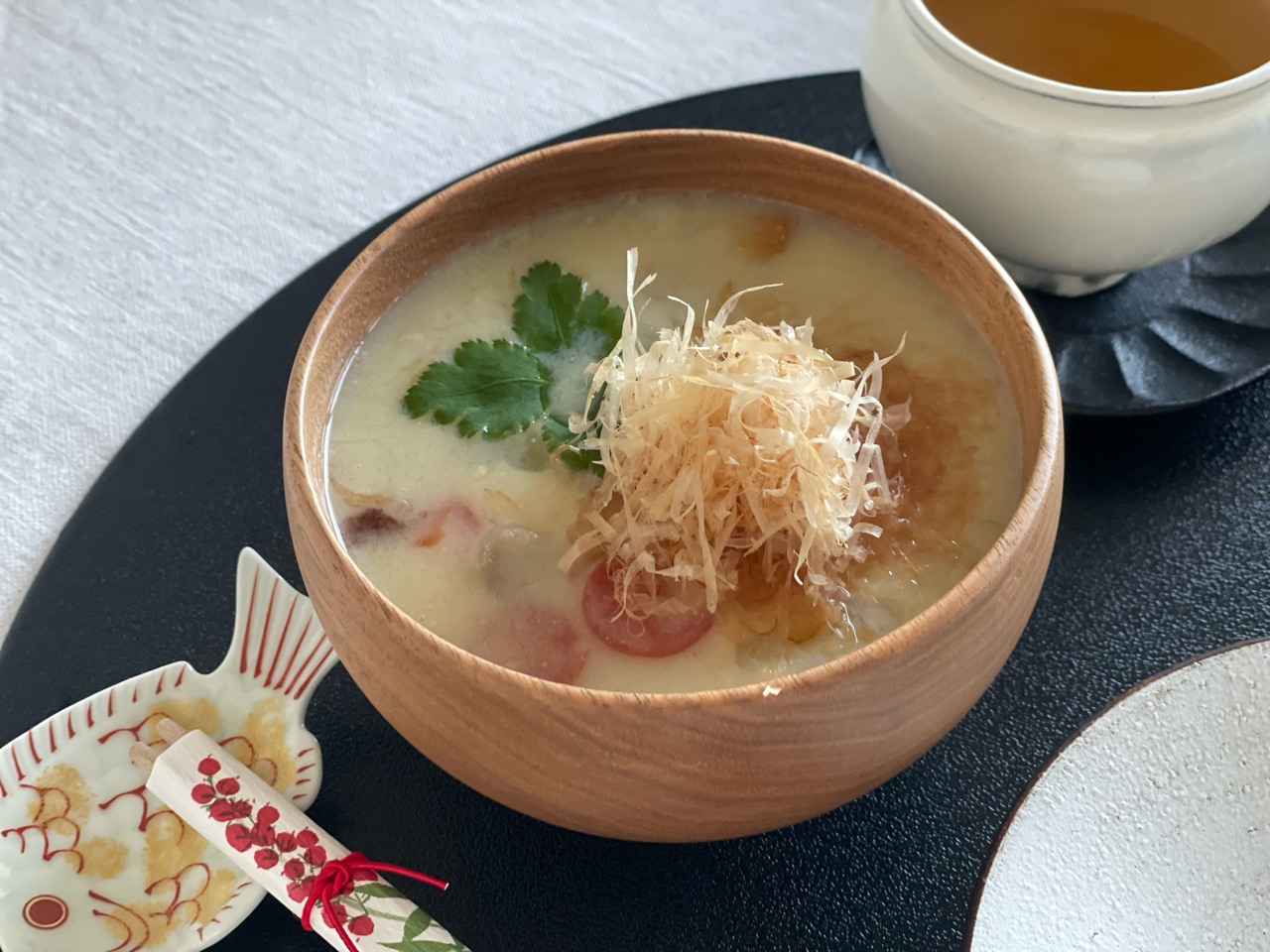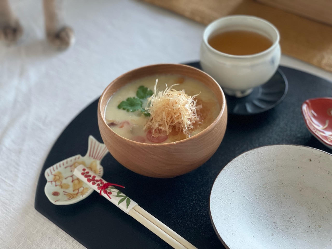 昆布だしの白味噌仕立てに丸餅を入れて、細い削り節を乗せました。