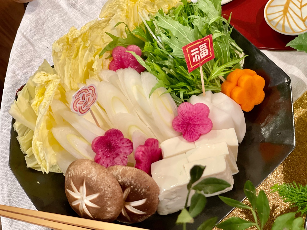 野菜はいつもと変わらないけど、花形に抜いたり飾りをつけたりして、お正月っぽくしてみました。
