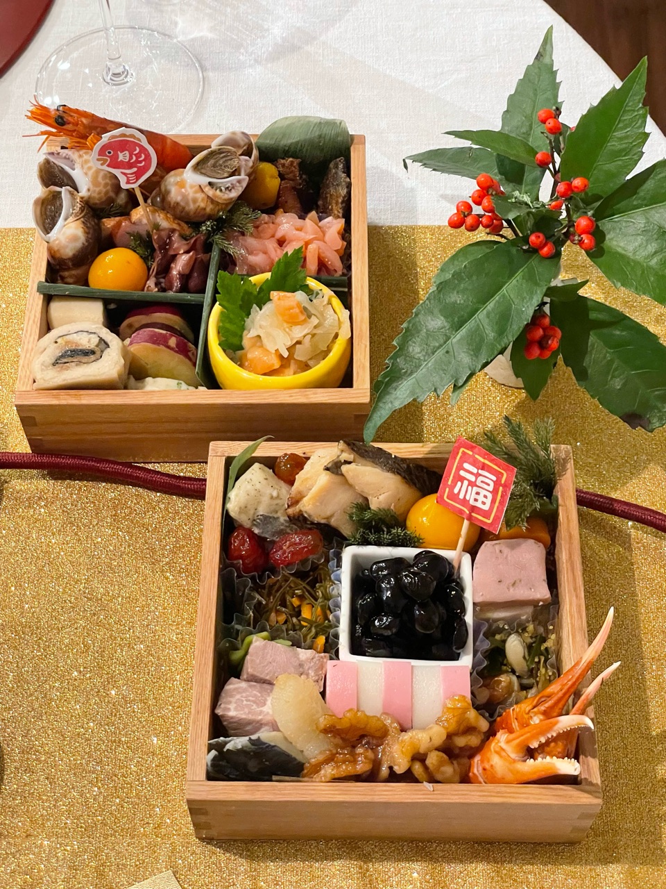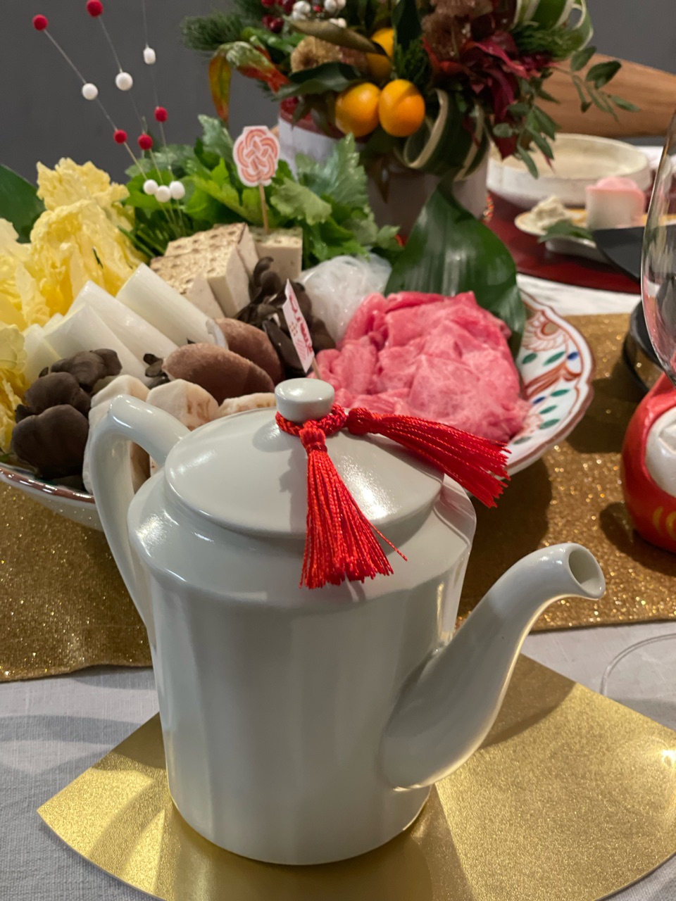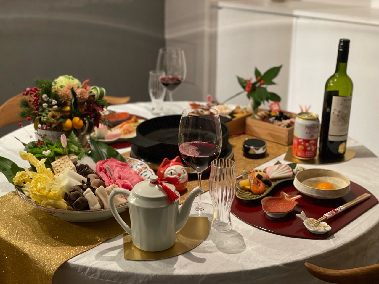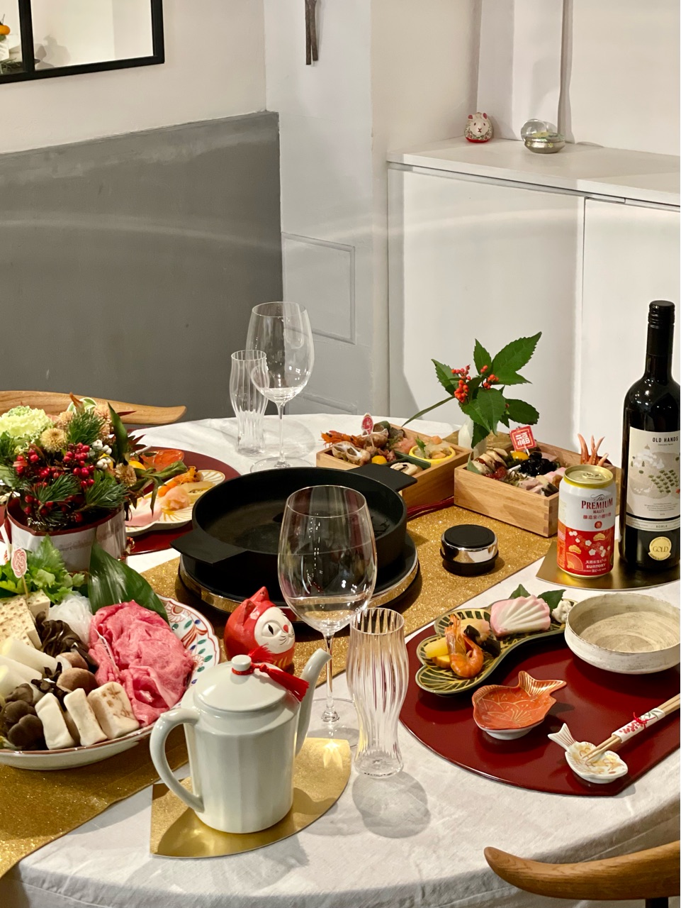 お正月っぽく、赤や金色のものををテーブルに散らして華やかにしました✨