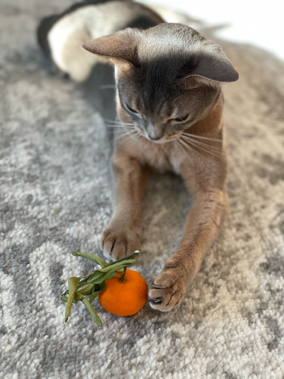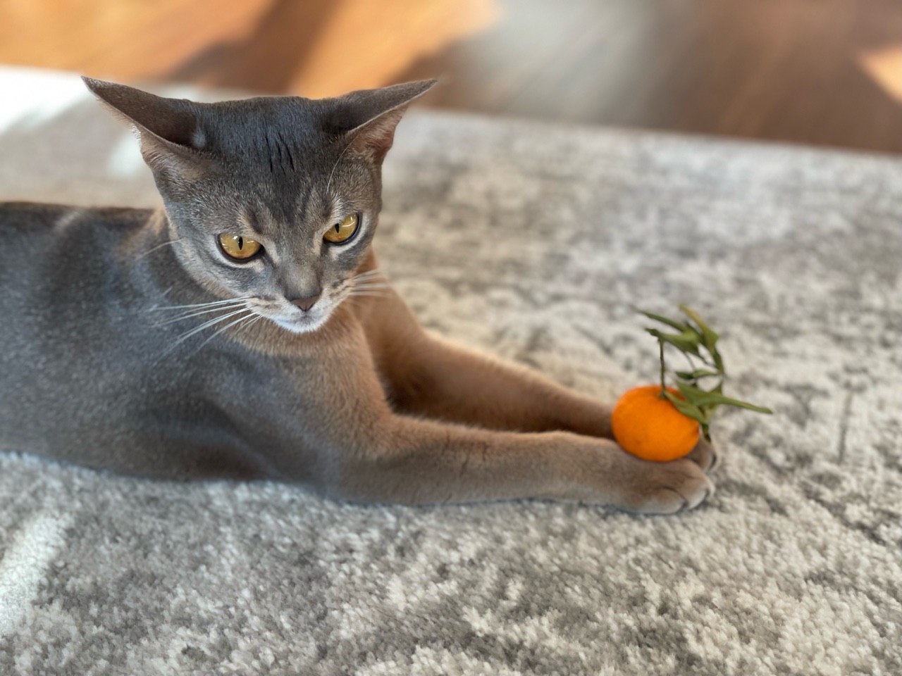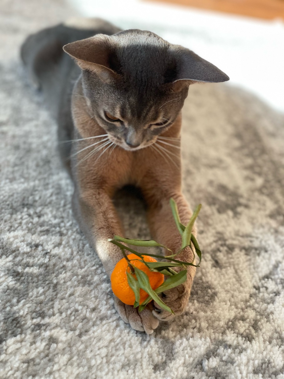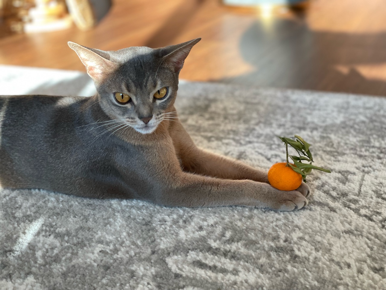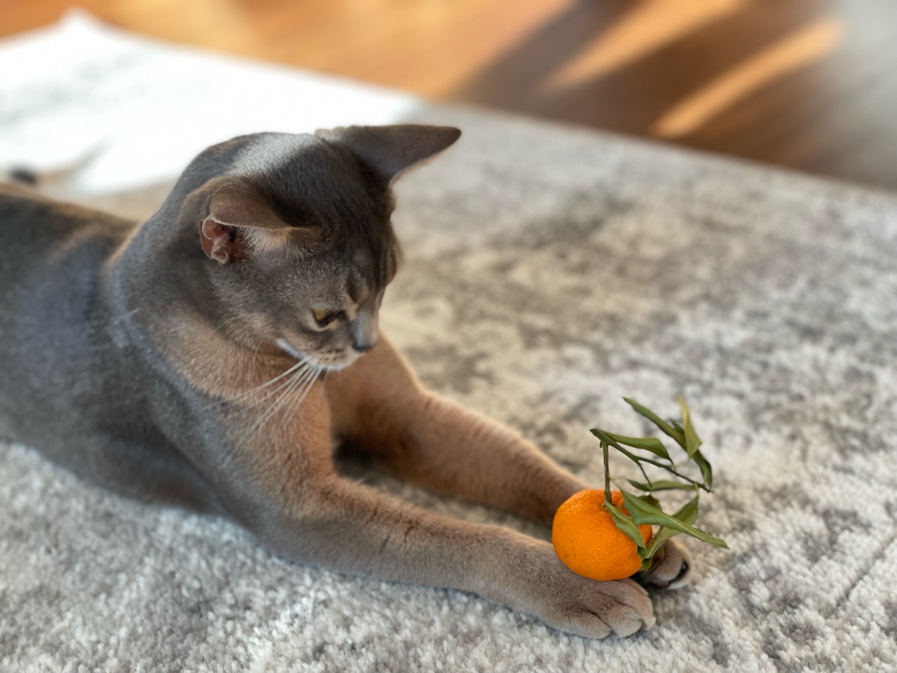 わか坊が両手を伸ばして寝そべってたから、橙置いてみたんです。