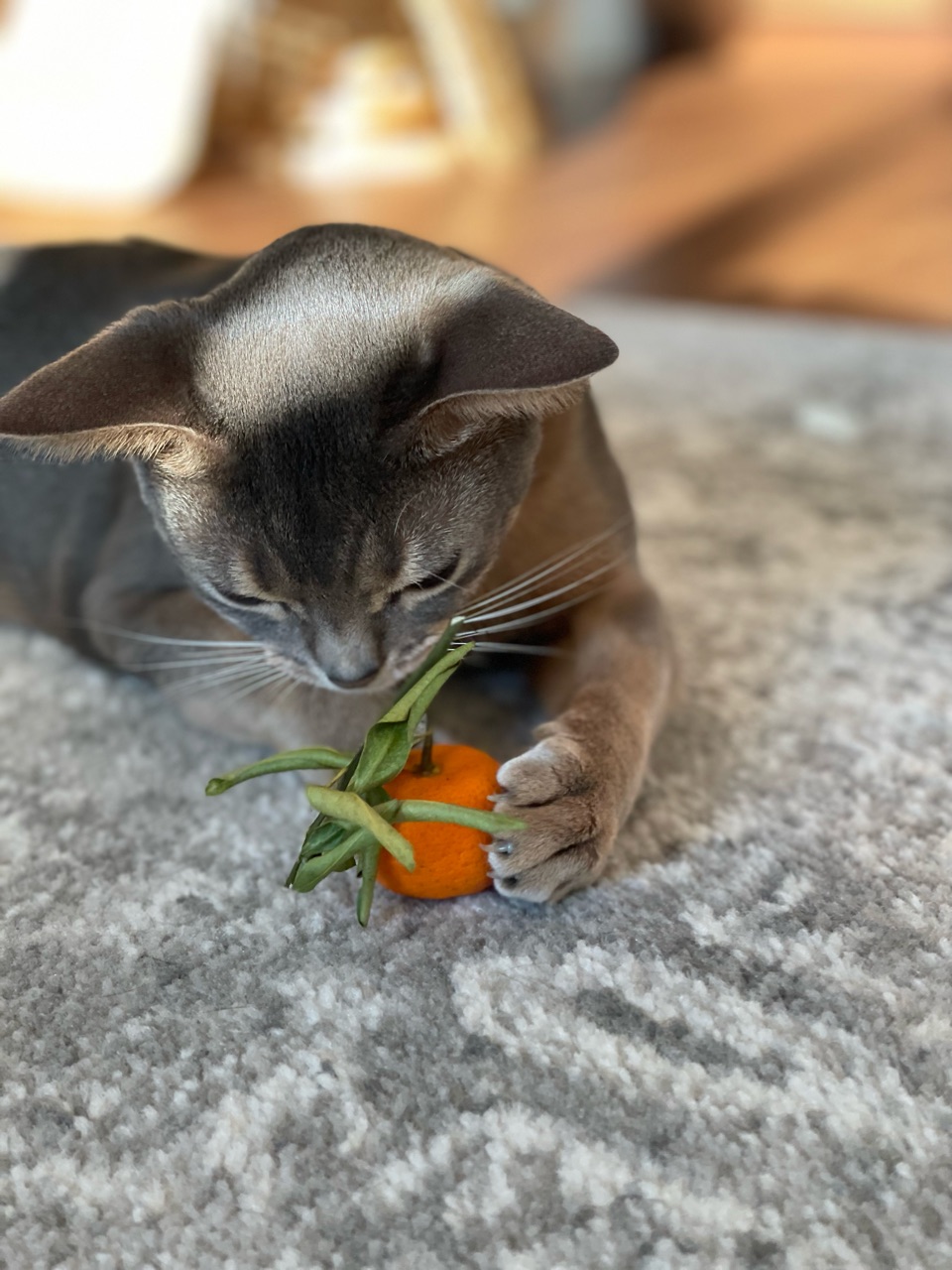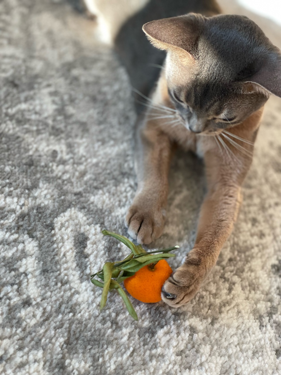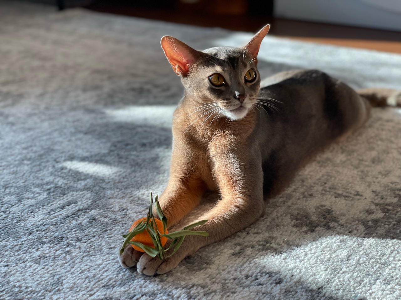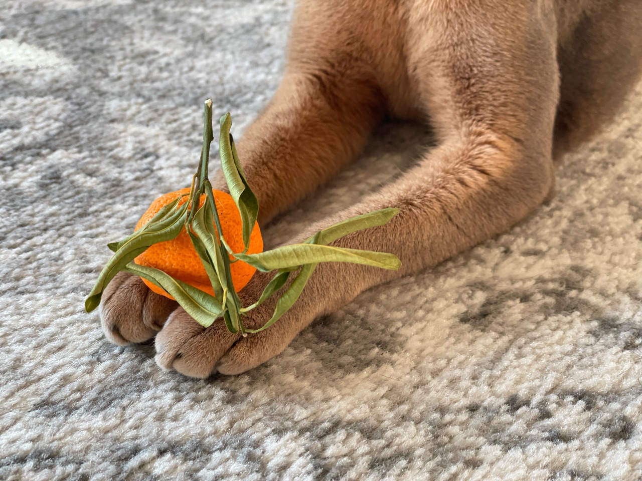 わか坊が両手を伸ばして寝そべってたから、橙置いてみたんです。