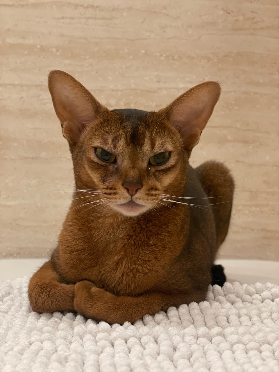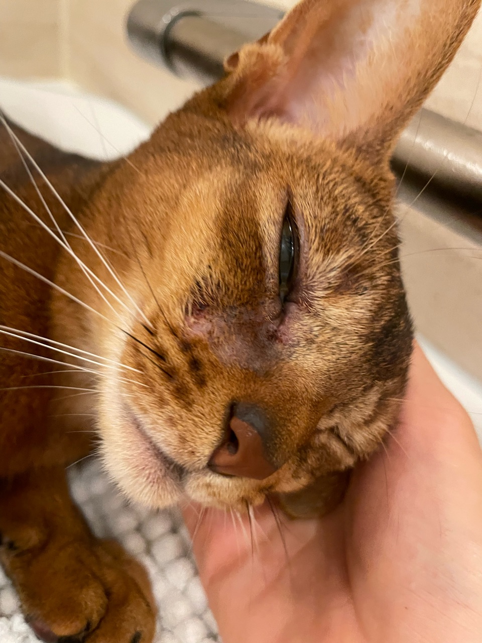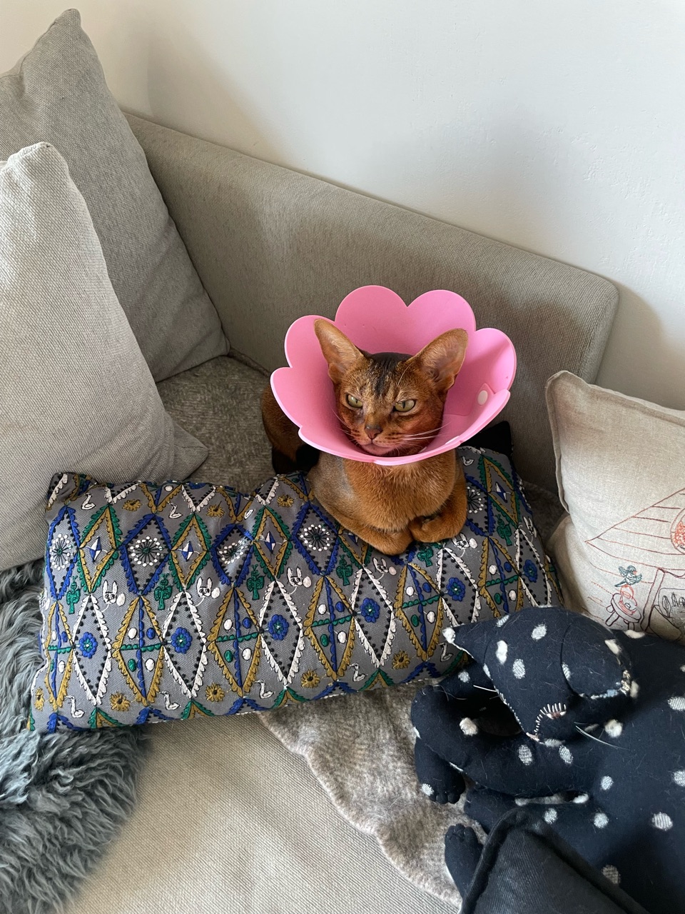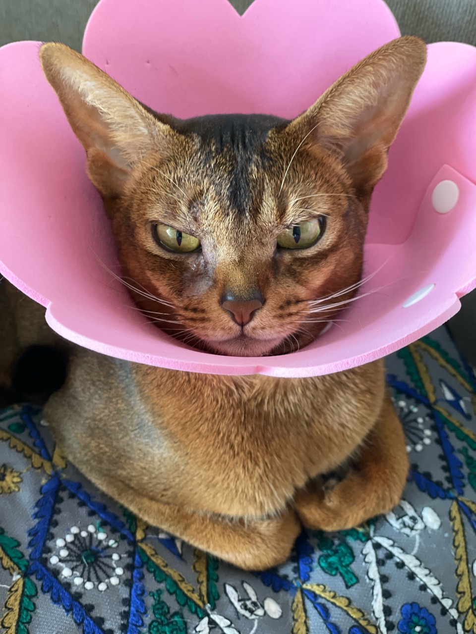 この間、激しく掻いたようで、ほっぺに傷ができてしまっているので、エリザベスカラーをつけています。
