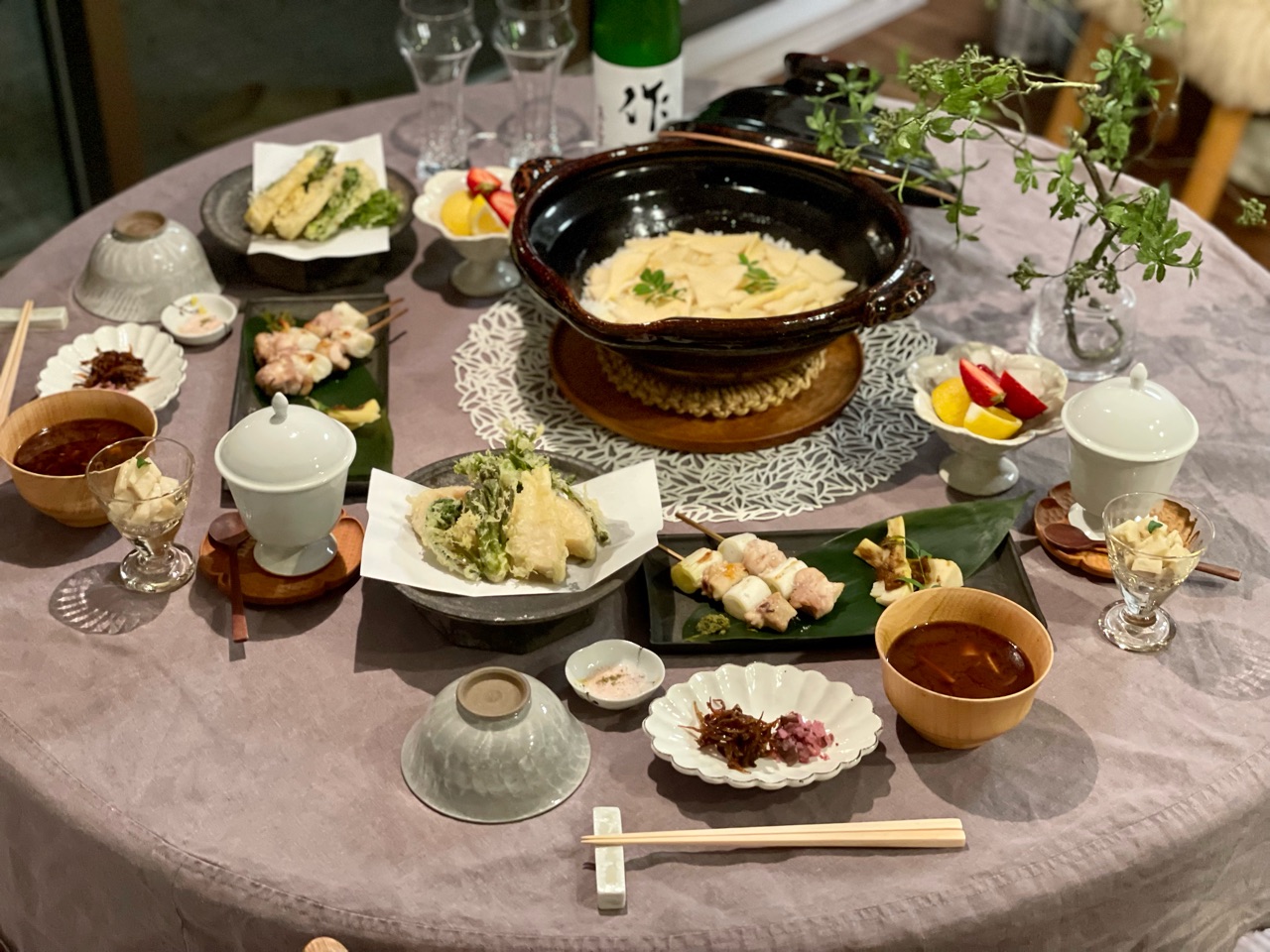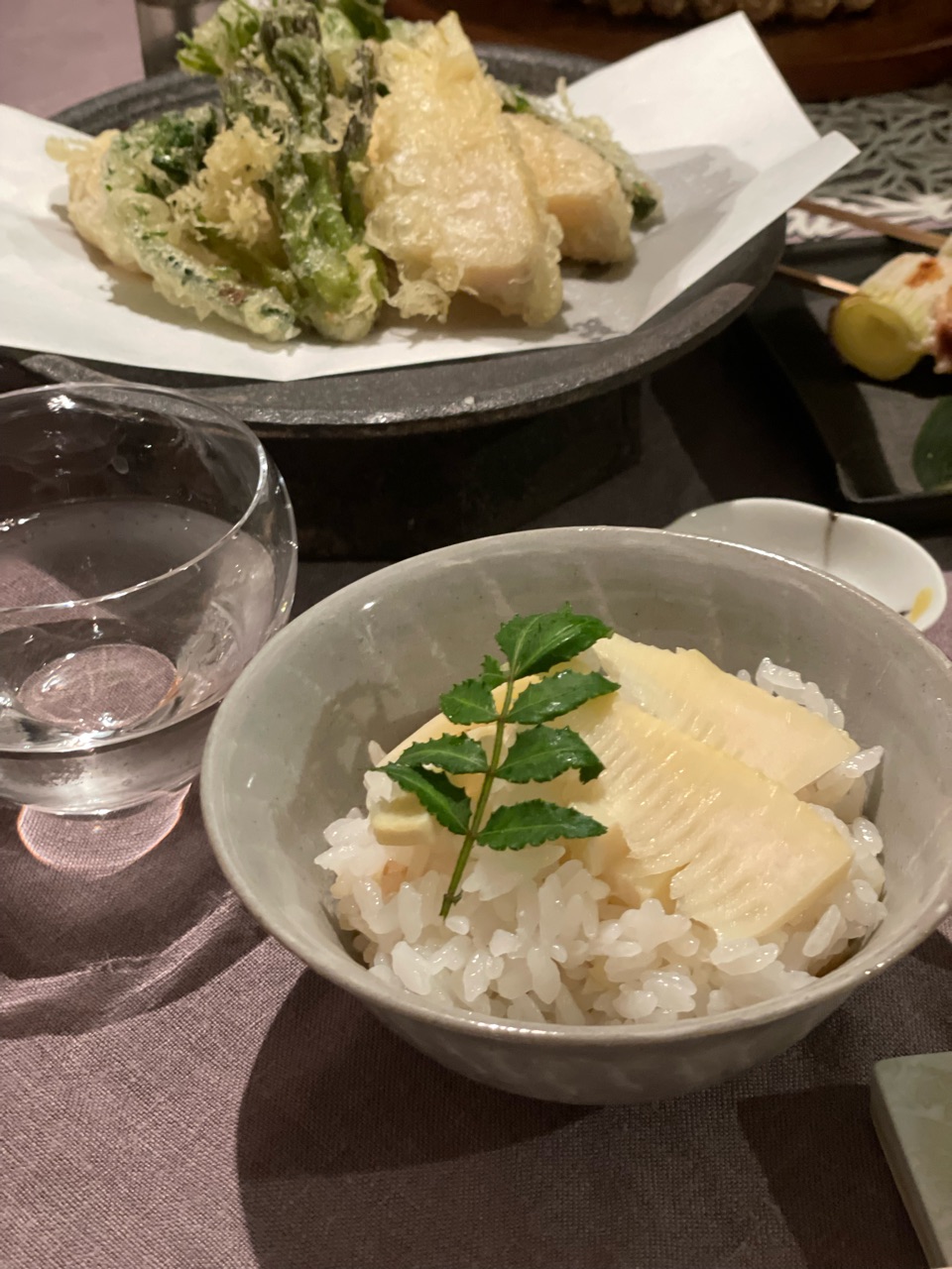 土鍋筍ごはん、天ぷら、焼き筍、山椒味噌和え、茶碗蒸し、赤だしと全6品。
