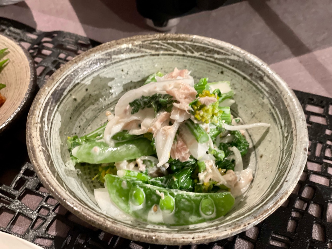 菜の花と新玉ねぎとスナップエンドウのツナマヨあえ