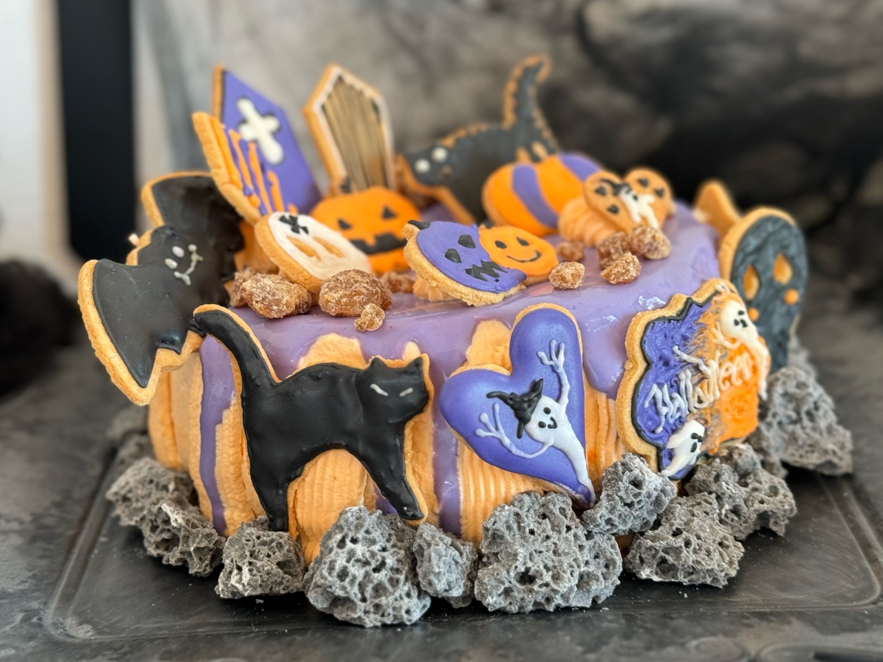 全体にオレンジ色のクリームを塗って、紫色のゼラチン入りのクリームをたらりんとたらした土台に、アイシングクッキーを飾りまくりました。