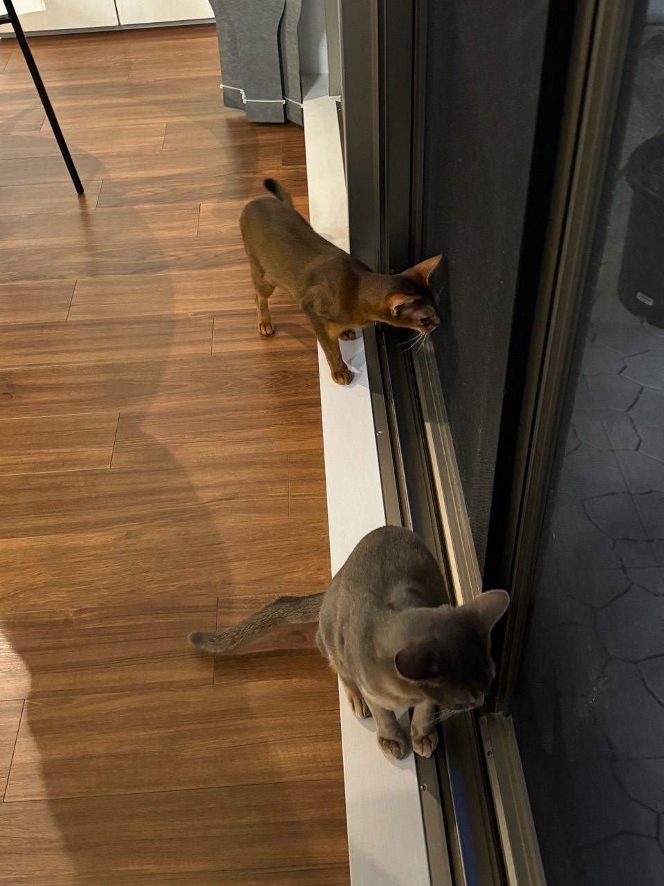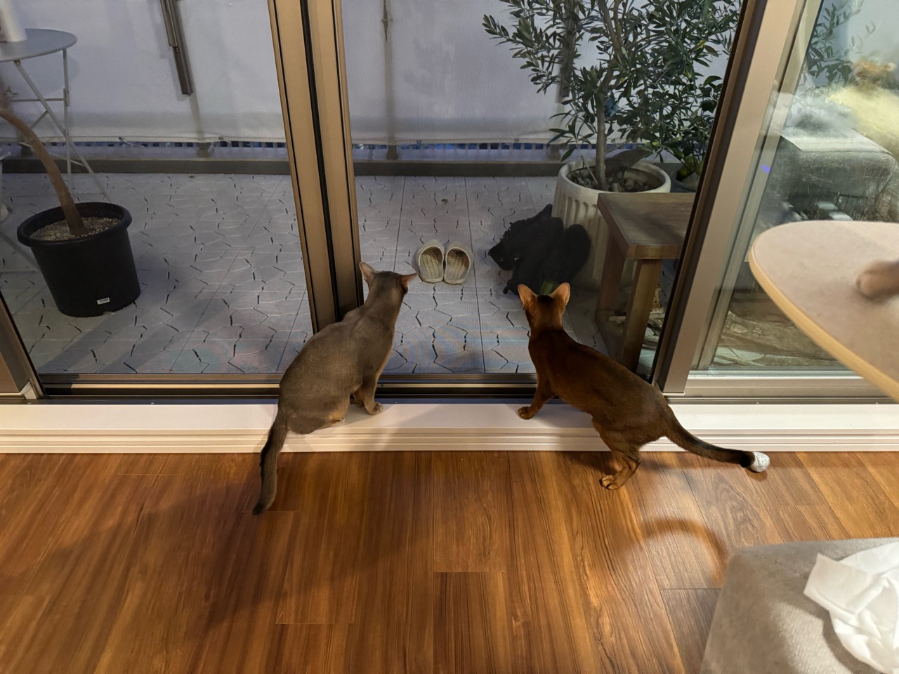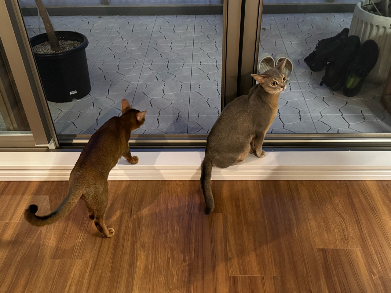 今夜は猫たちが食卓に来なかったので、夕方に外の葉っぱに夢中なりすわかを置いときます。