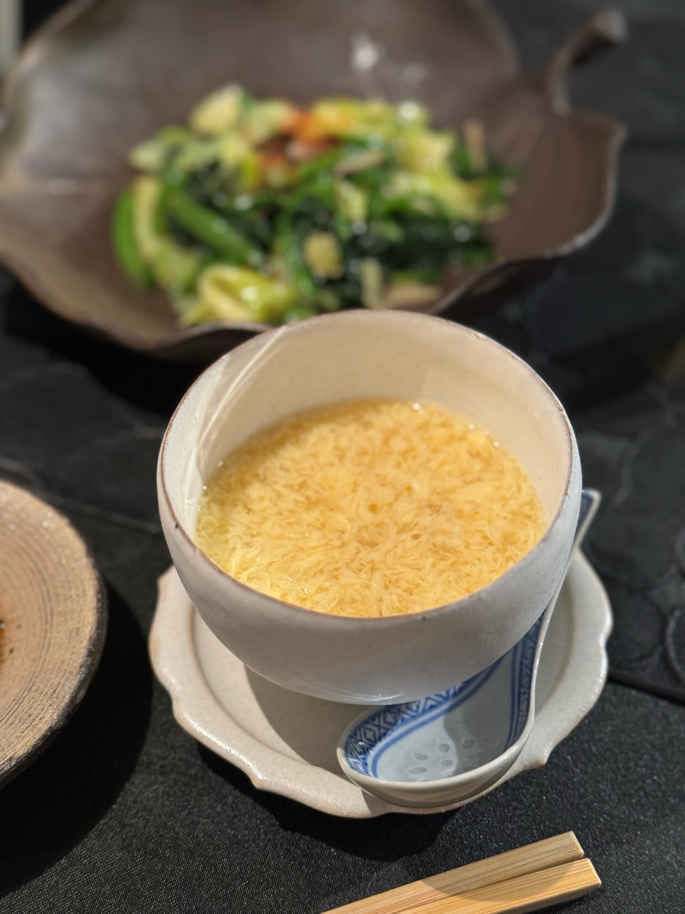片栗粉でトロミをつけてから、細く垂らした溶き卵をゆっくりと混ぜて仕上げました。