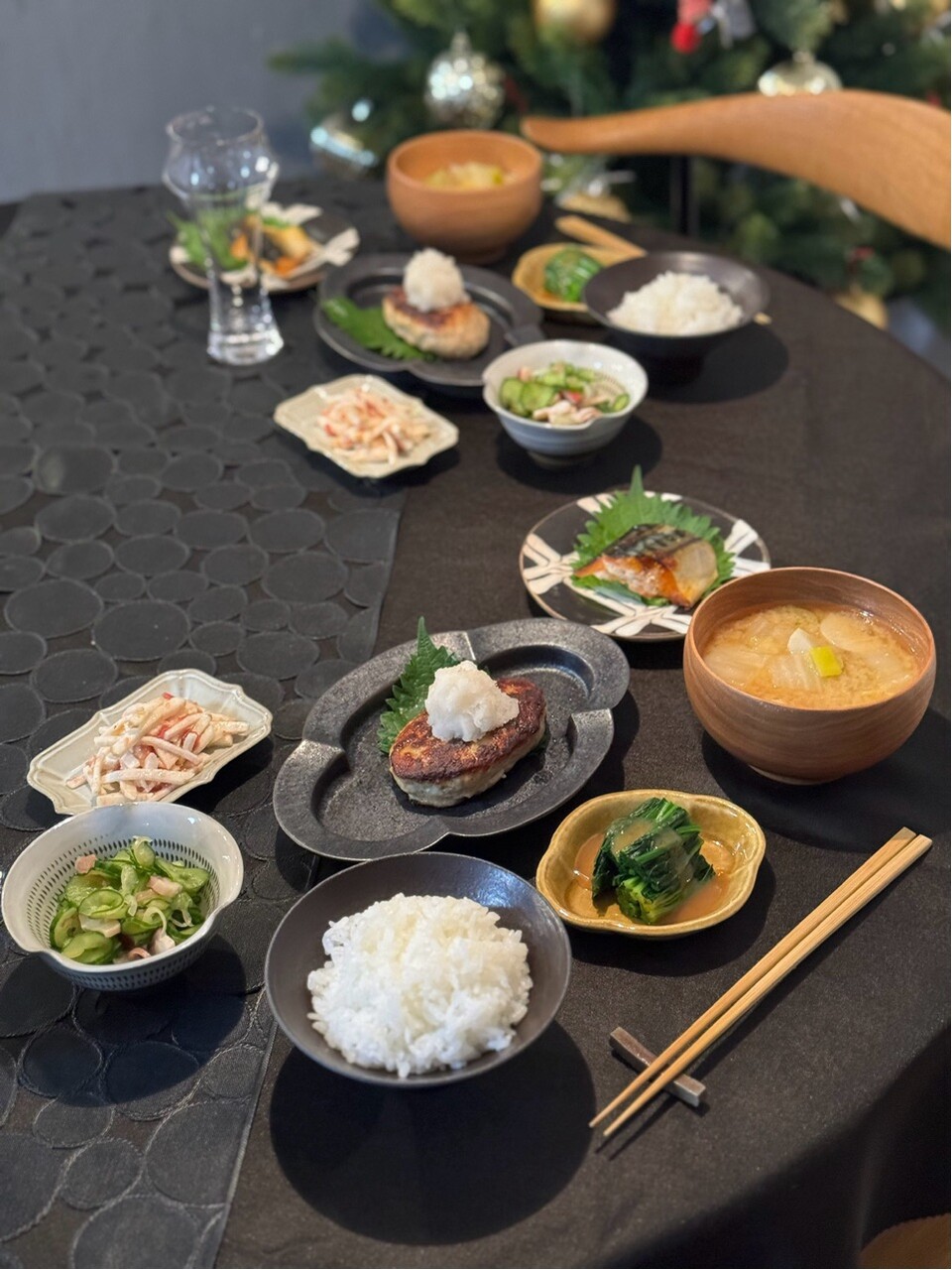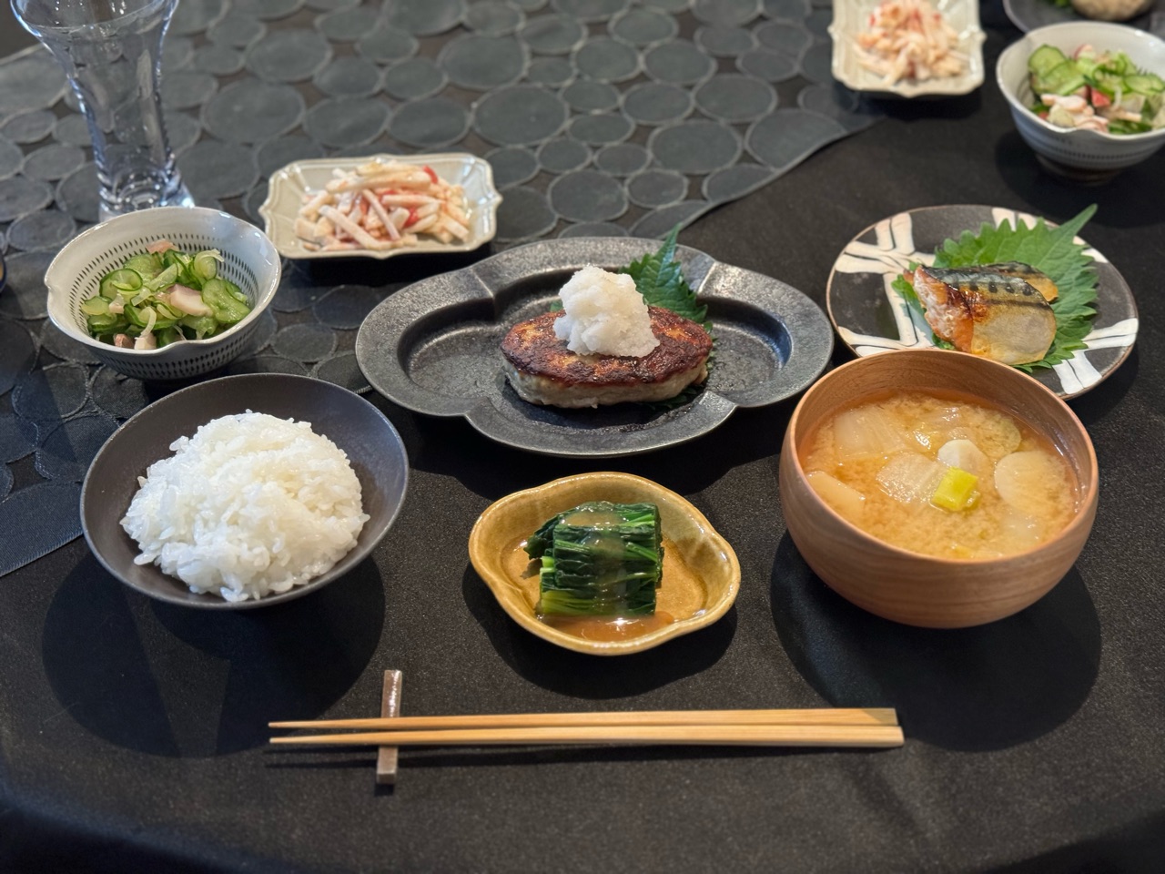 冷凍庫の在庫を使って用意したよ。と、ハンバーグや塩鯖を焼いて、副菜も色々作ってくれてました。