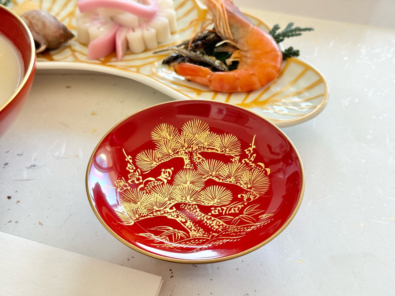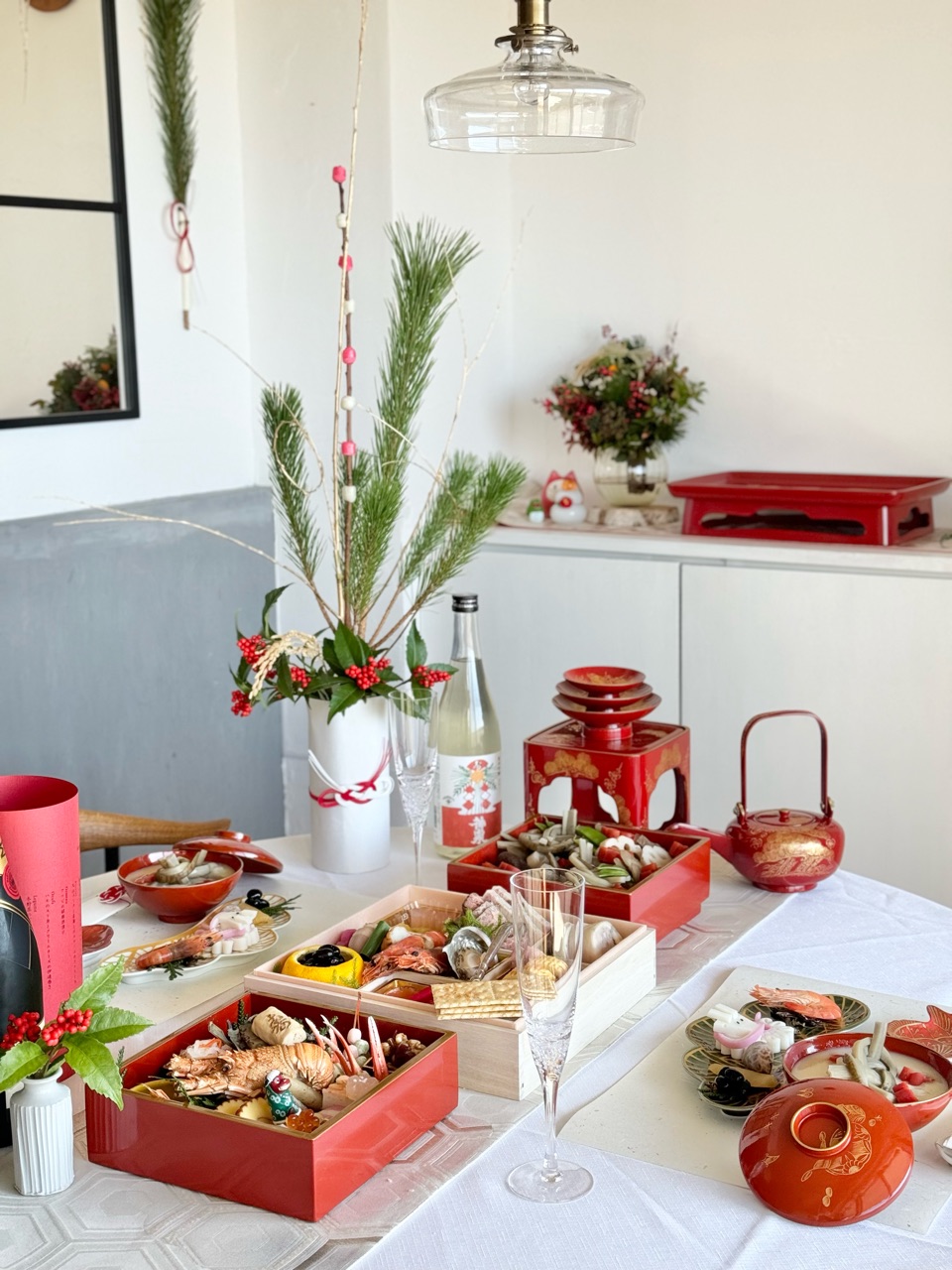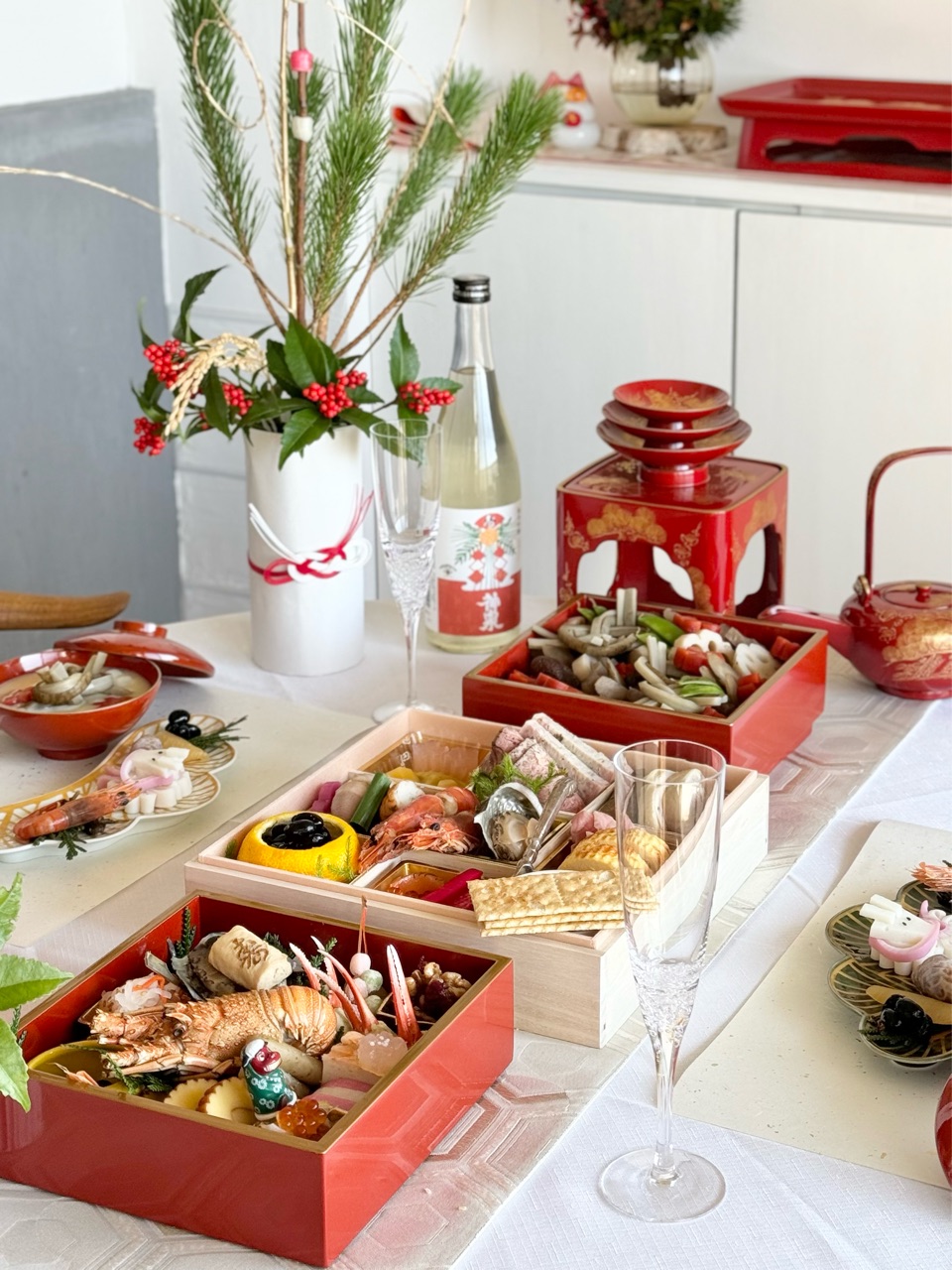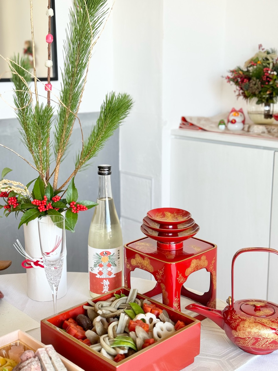 今年は、実家から持ってきた漆の重箱やお屠蘇セットを並べたら、赤色がいっぱいでおめでたい雰囲気が上がりました。