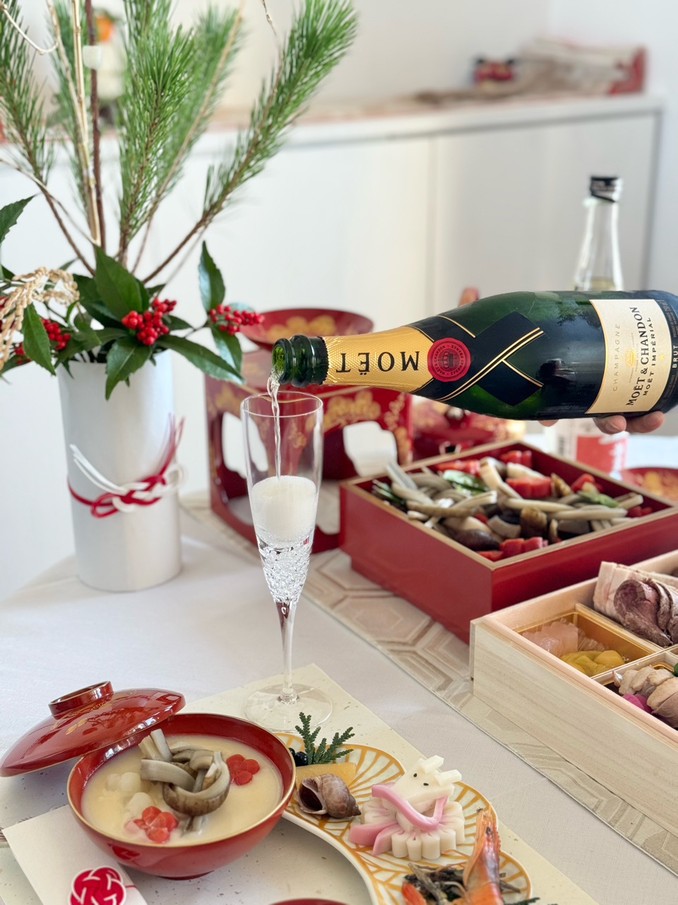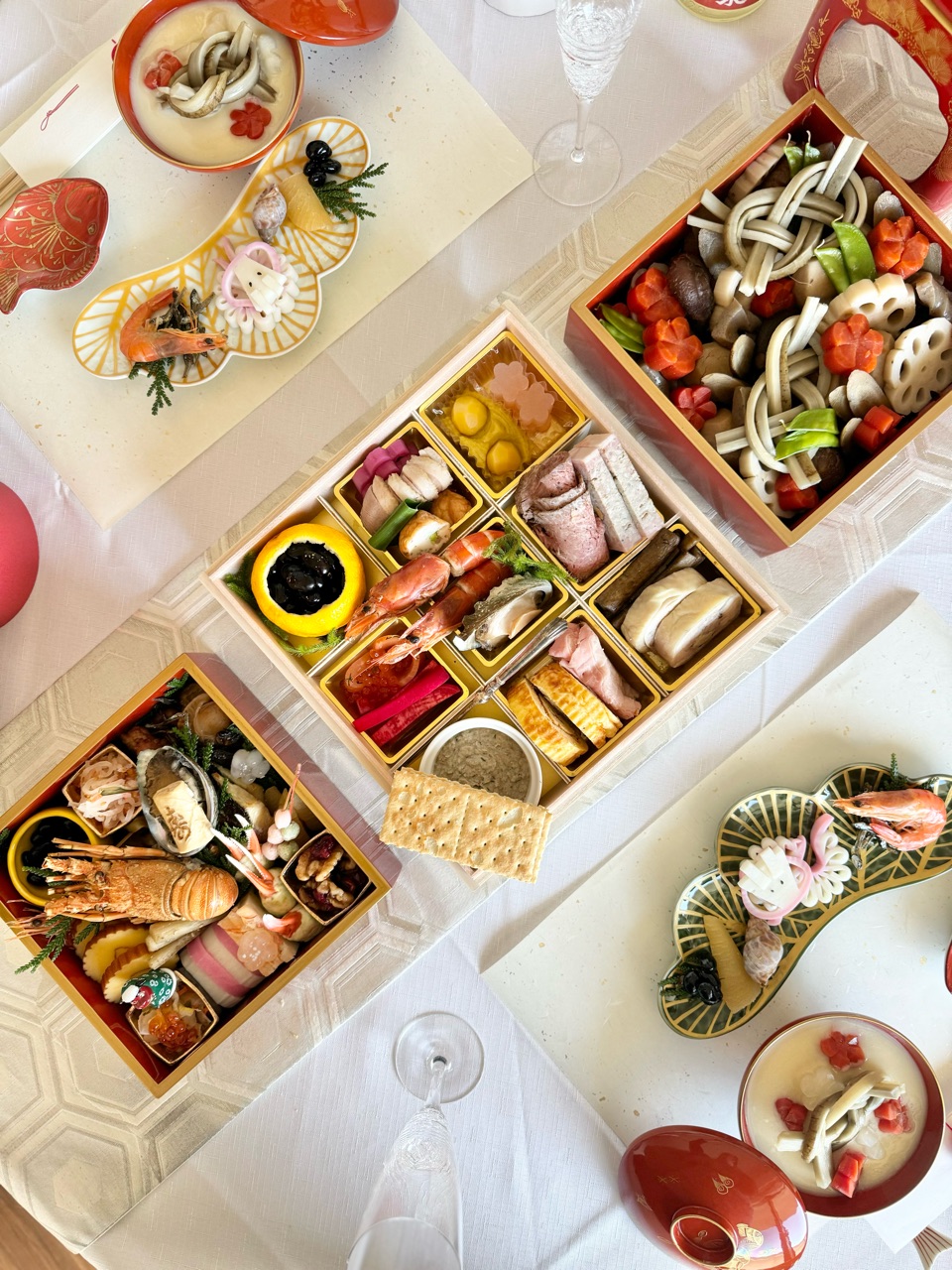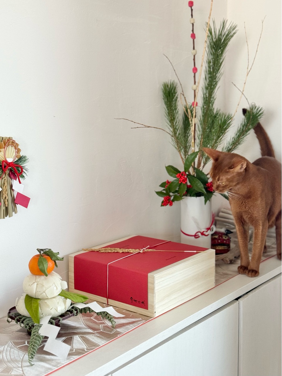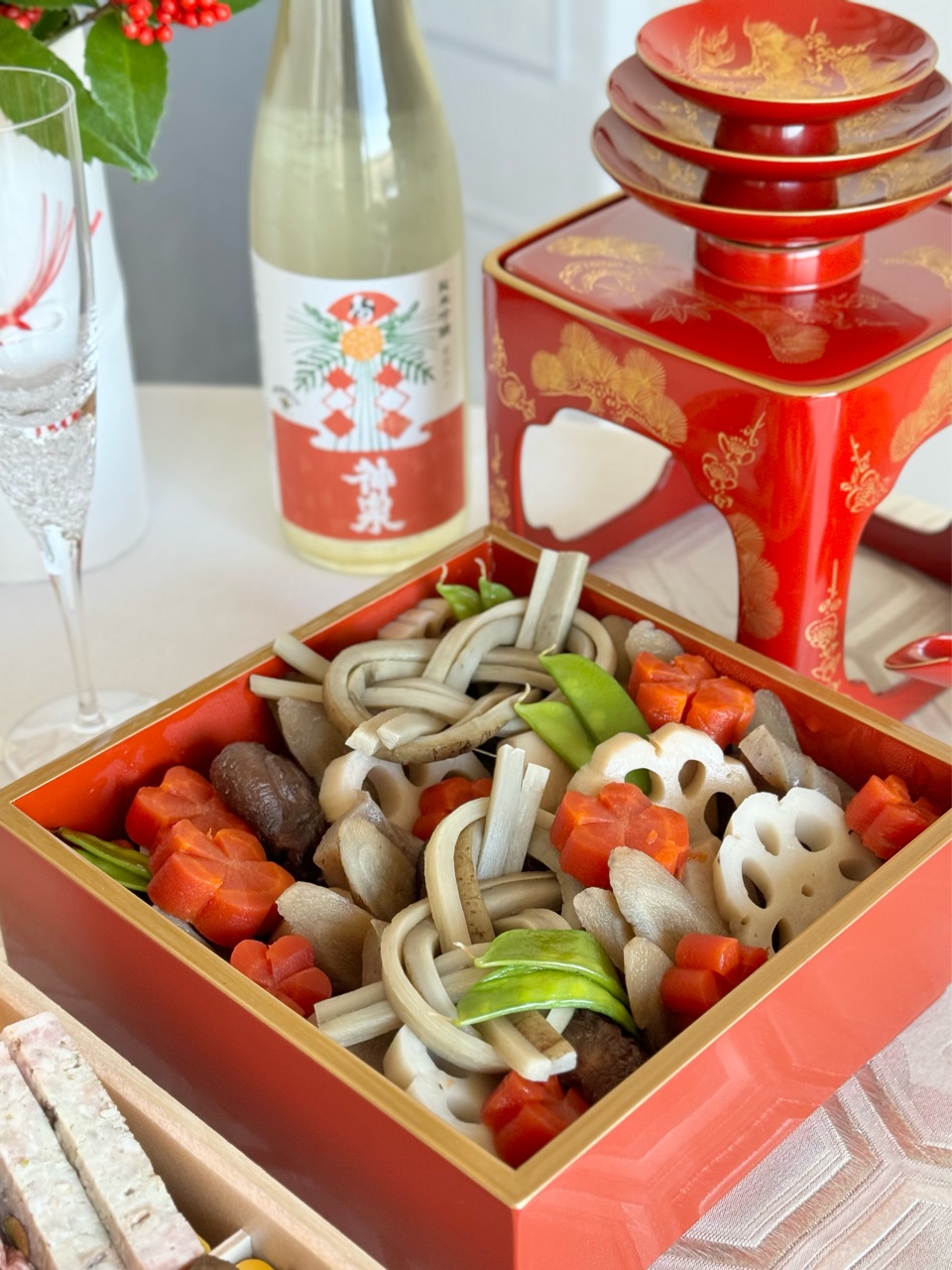 今年は、実家から持ってきた漆の重箱やお屠蘇セットを並べたら、赤色がいっぱいでおめでたい雰囲気が上がりました。
