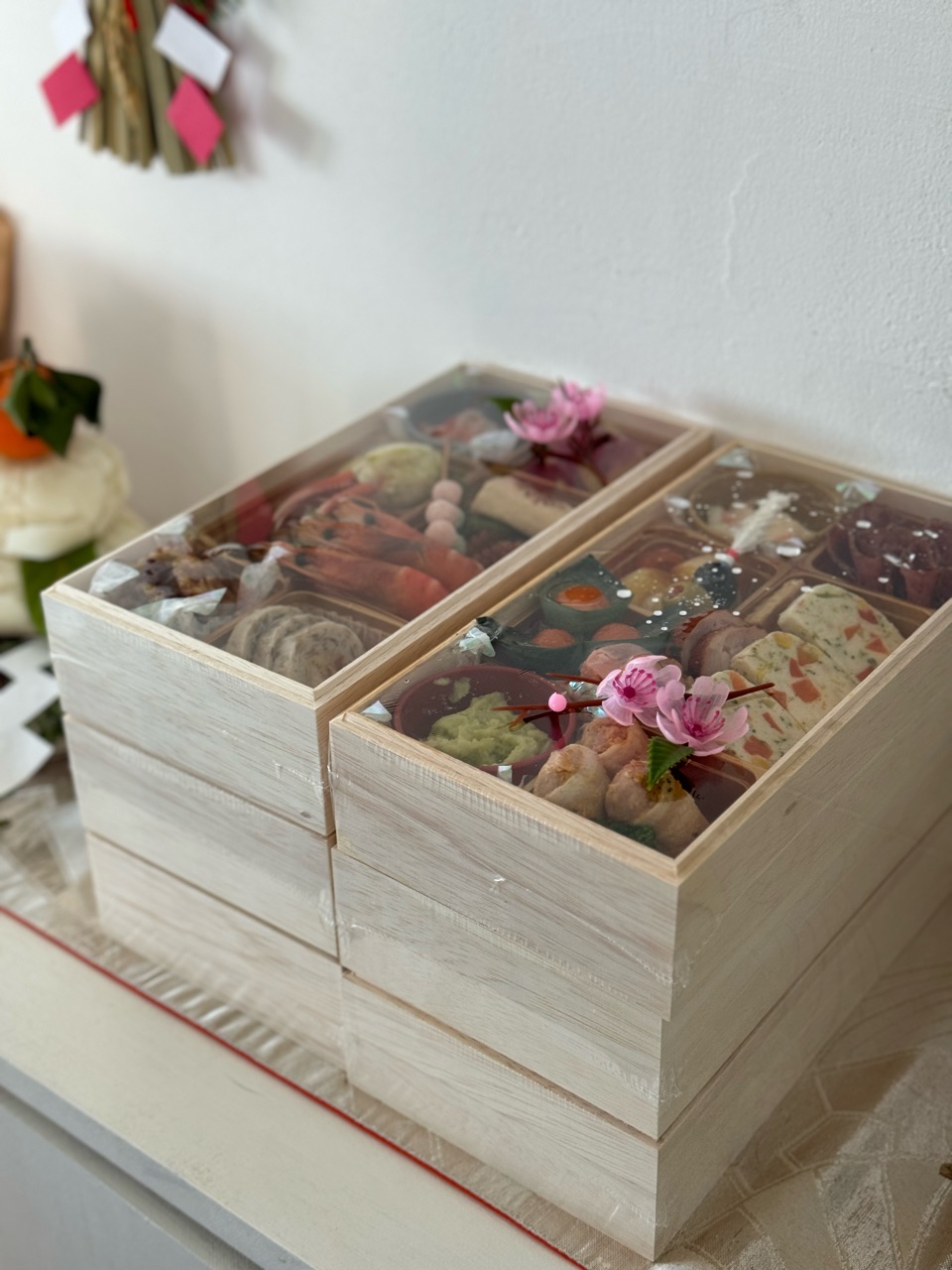 今年は半分サイズの箱が6箱の変わったお節でした。