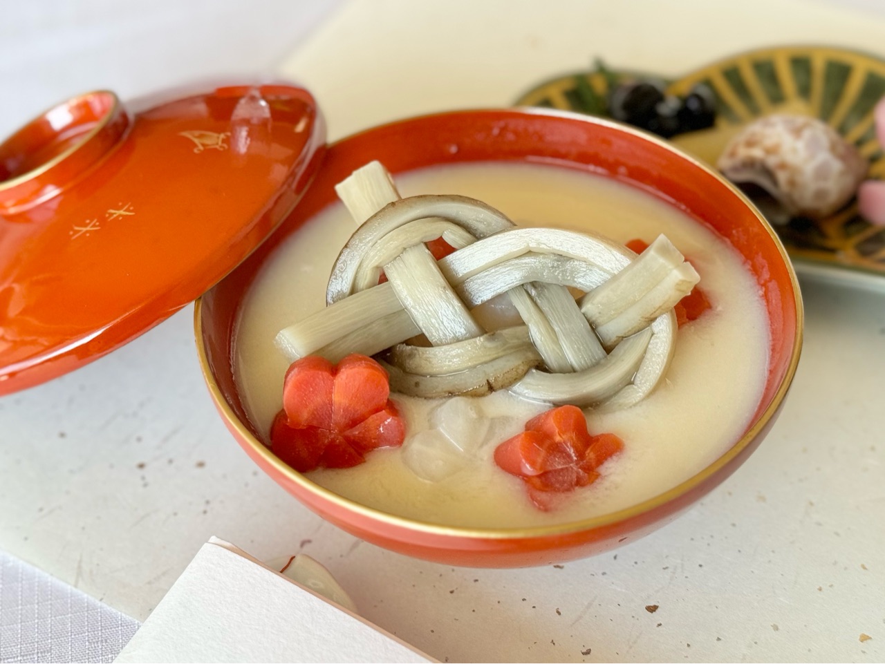 お雑煮は、だんなさまの出身に合わせて白味噌仕立て。
