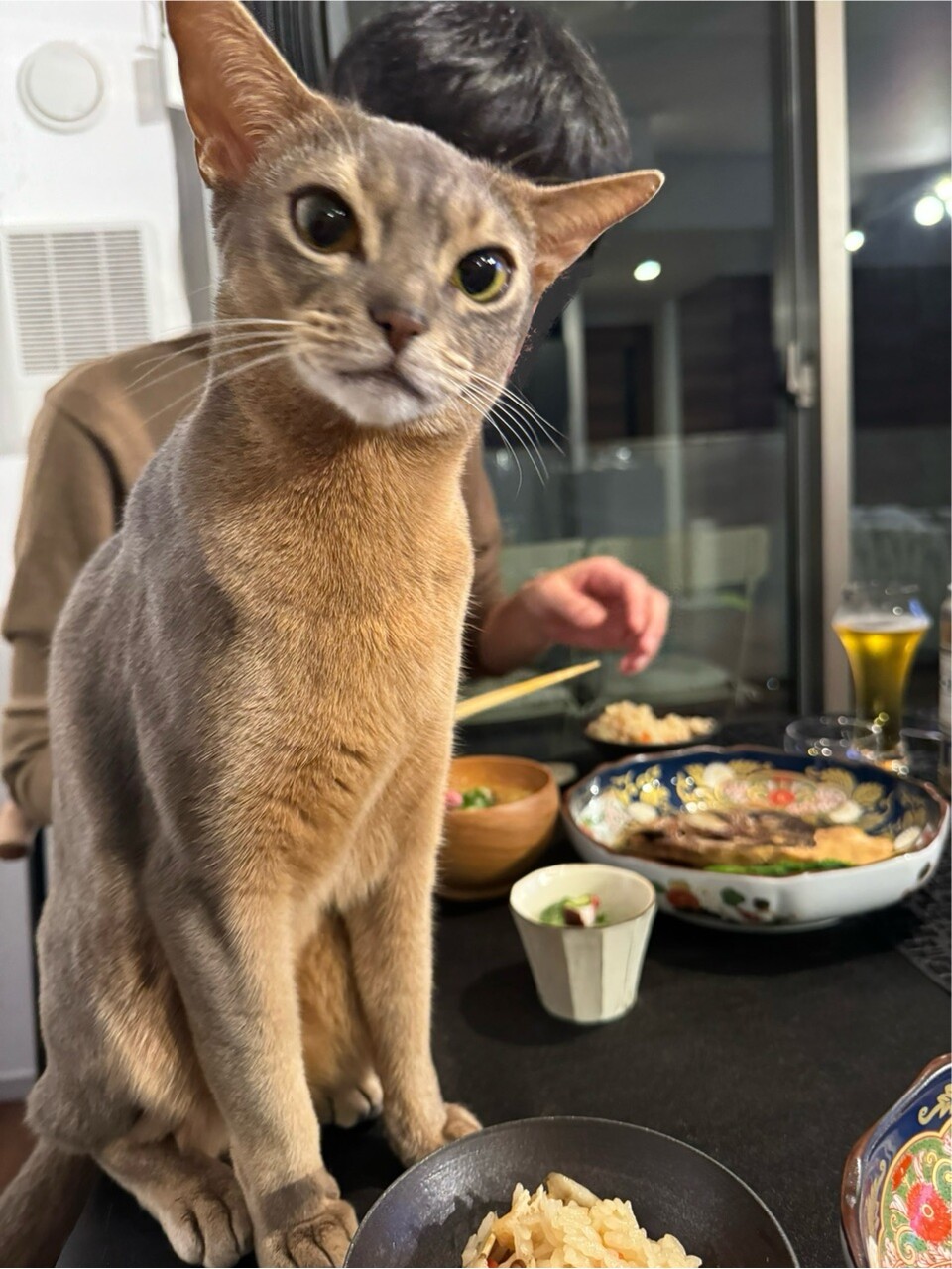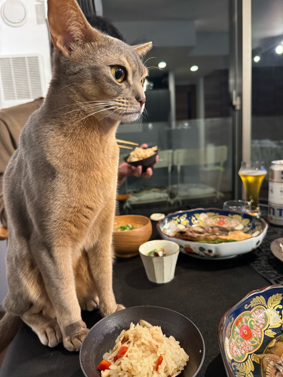 思い当たりますか?私はアビシニアンをこのブログの登場猫達でしか知らないけど、一般的に野生が強く残り活動的過ぎて懐きにくいと言われてる事は知ってました。じょりじょり家の猫ちゃん達を知らなきゃ懐きにくいんだと思ってしまうところでした😅懐きにくいどころか全員ベタベタの甘えっ子だしひなちゃんに野生が強く残ってたとは思えません🤣でもあの食いしん坊さはある意味野生の本能ですかね?