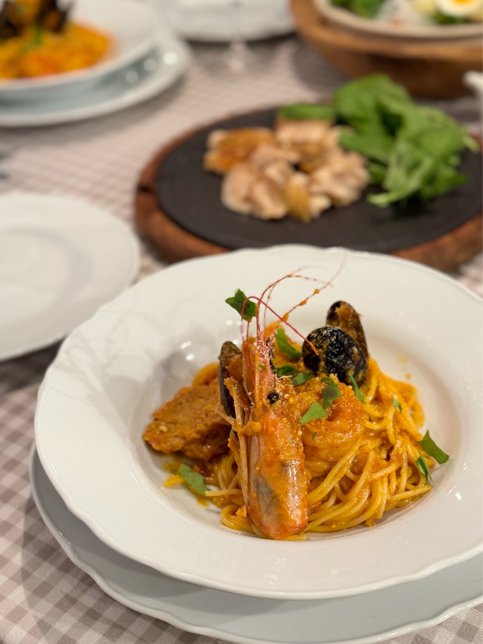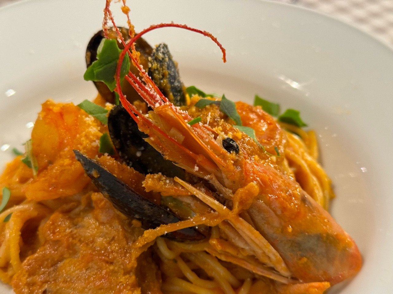 エビの頭と海老味噌をじっくりと炒めて香りを出した、海の幸たっぷりのトマトソース✨