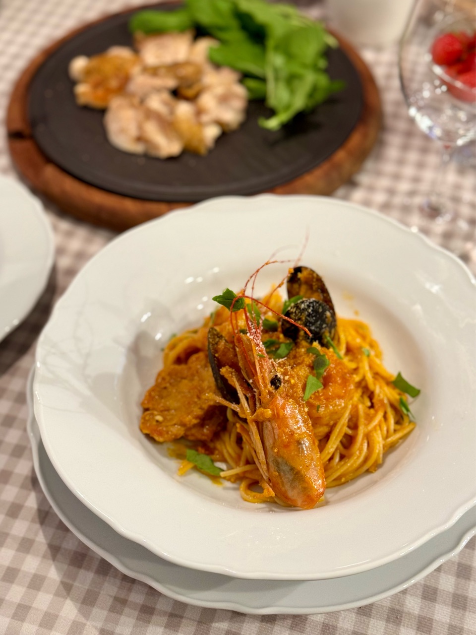 春に作ったトマトソースを使ったペスカトーレ✨
