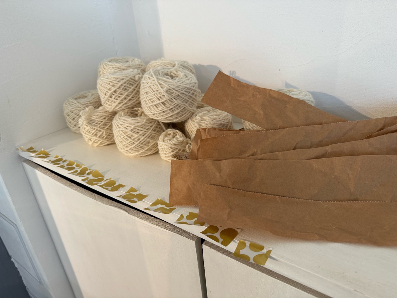 毛糸玉が崩れないように、紙を巻きました。