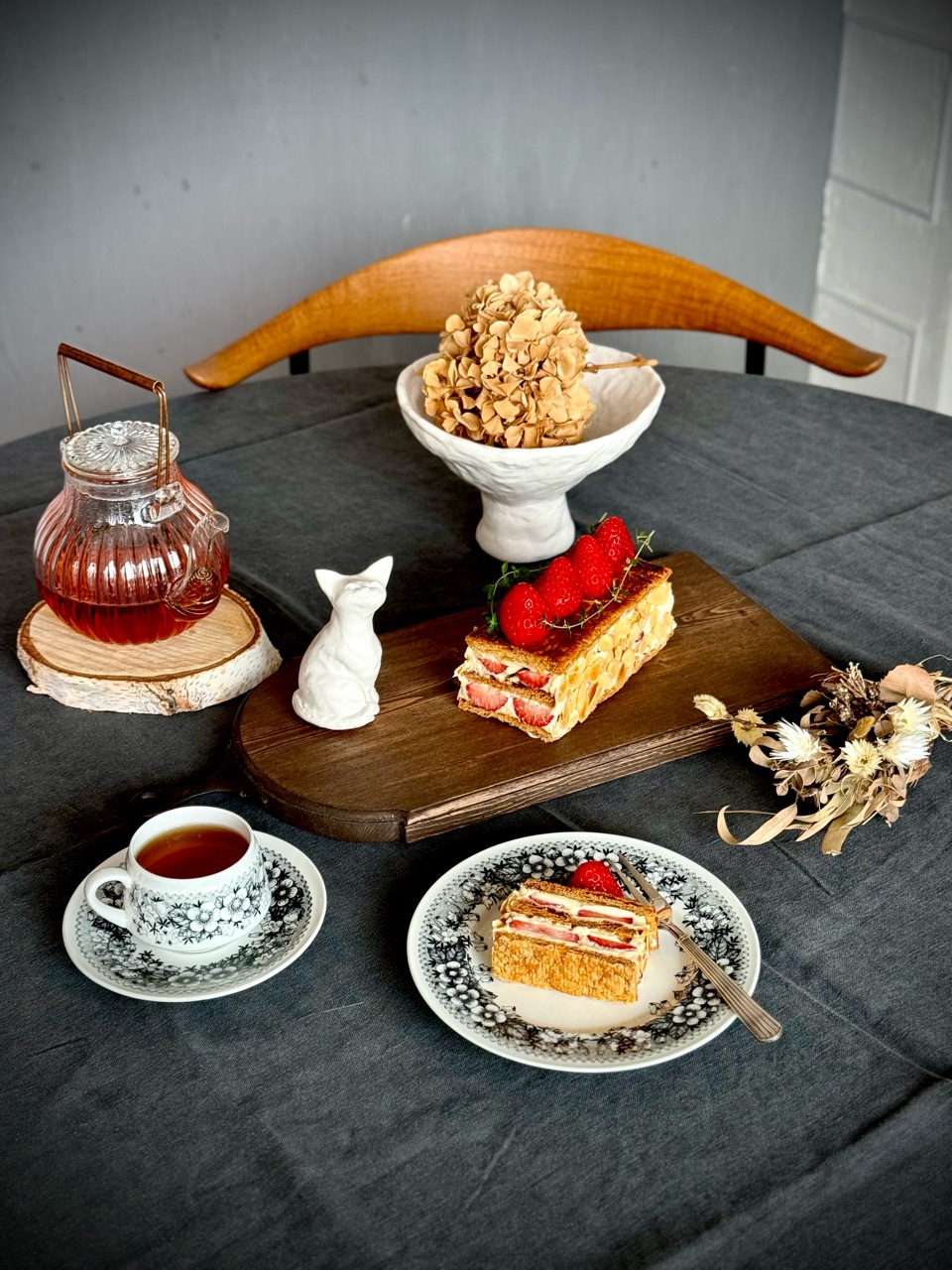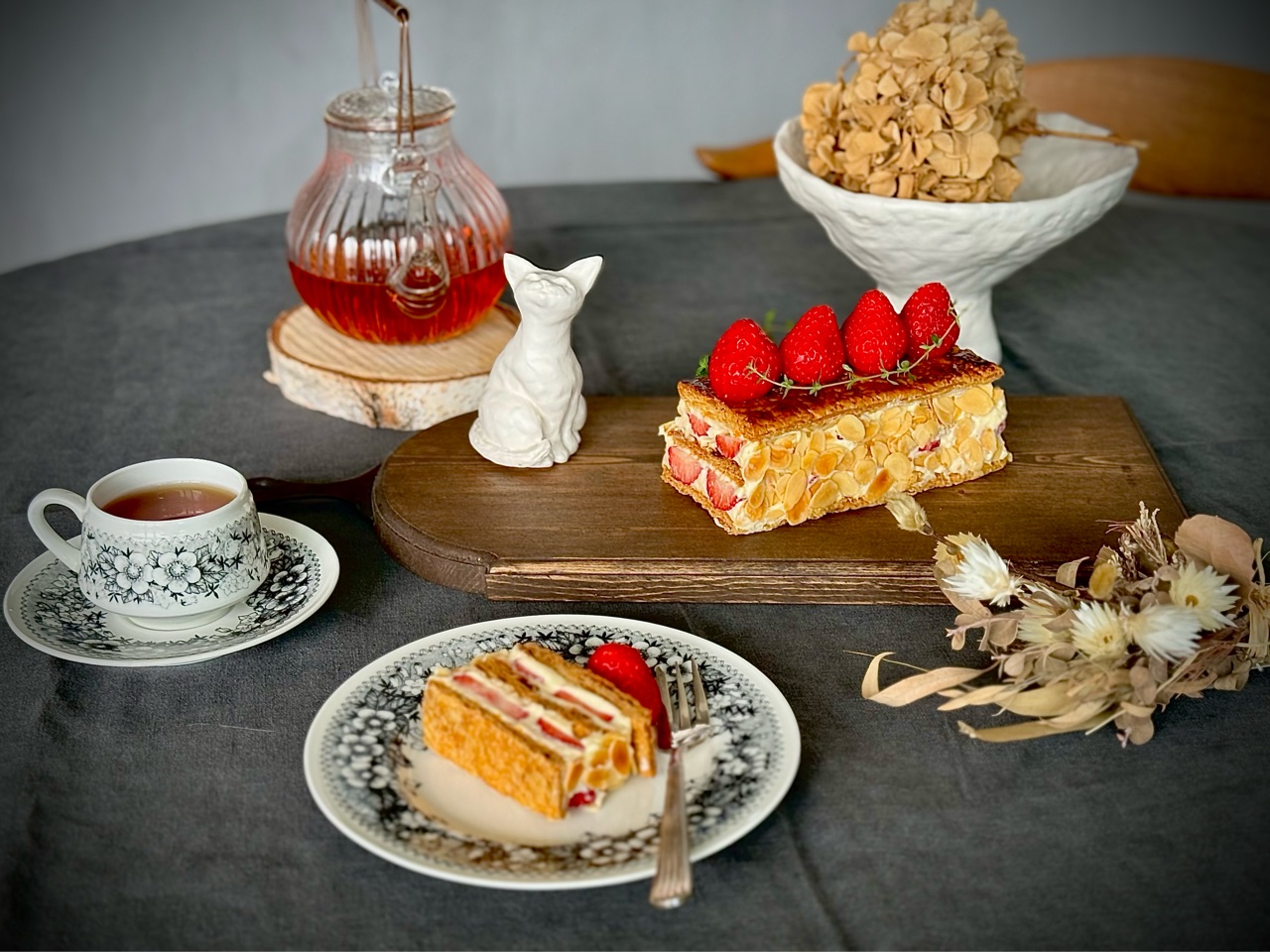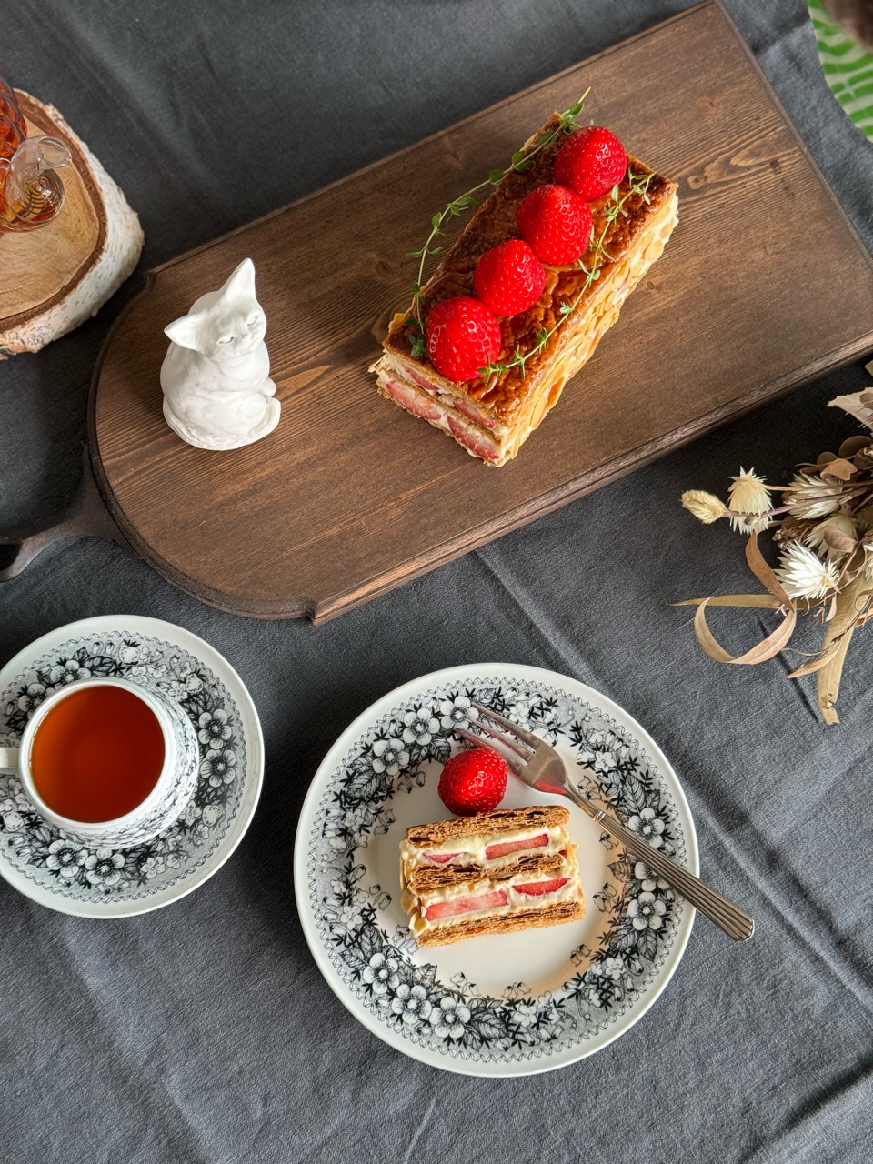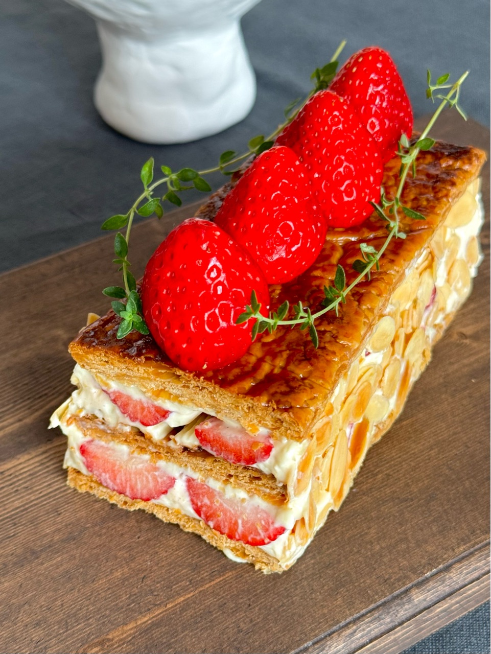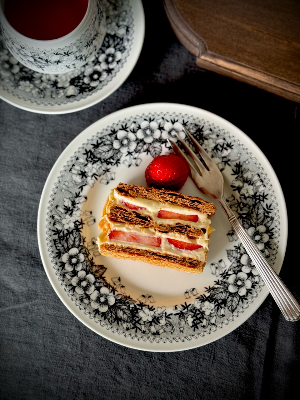 しっかりと焼き込んだ香ばしいパイ生地と、甘いクレームディプロマットと、甘酸っぱいいちごが美味しいナポレオンパイができました✨