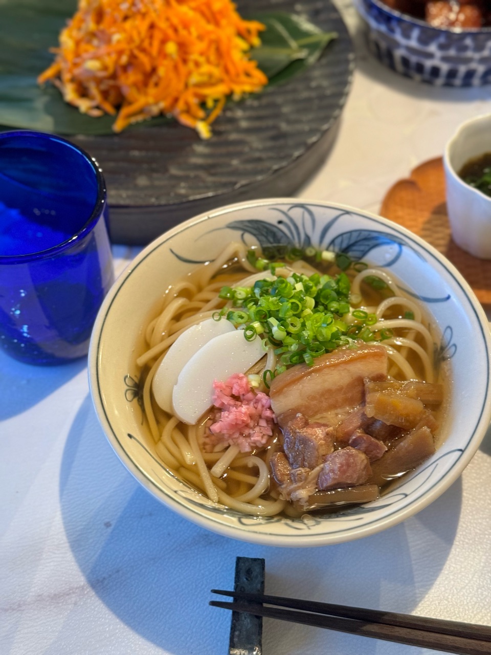 ソーキそばは、かまぼこや紅生姜、小ネギをトッピング。