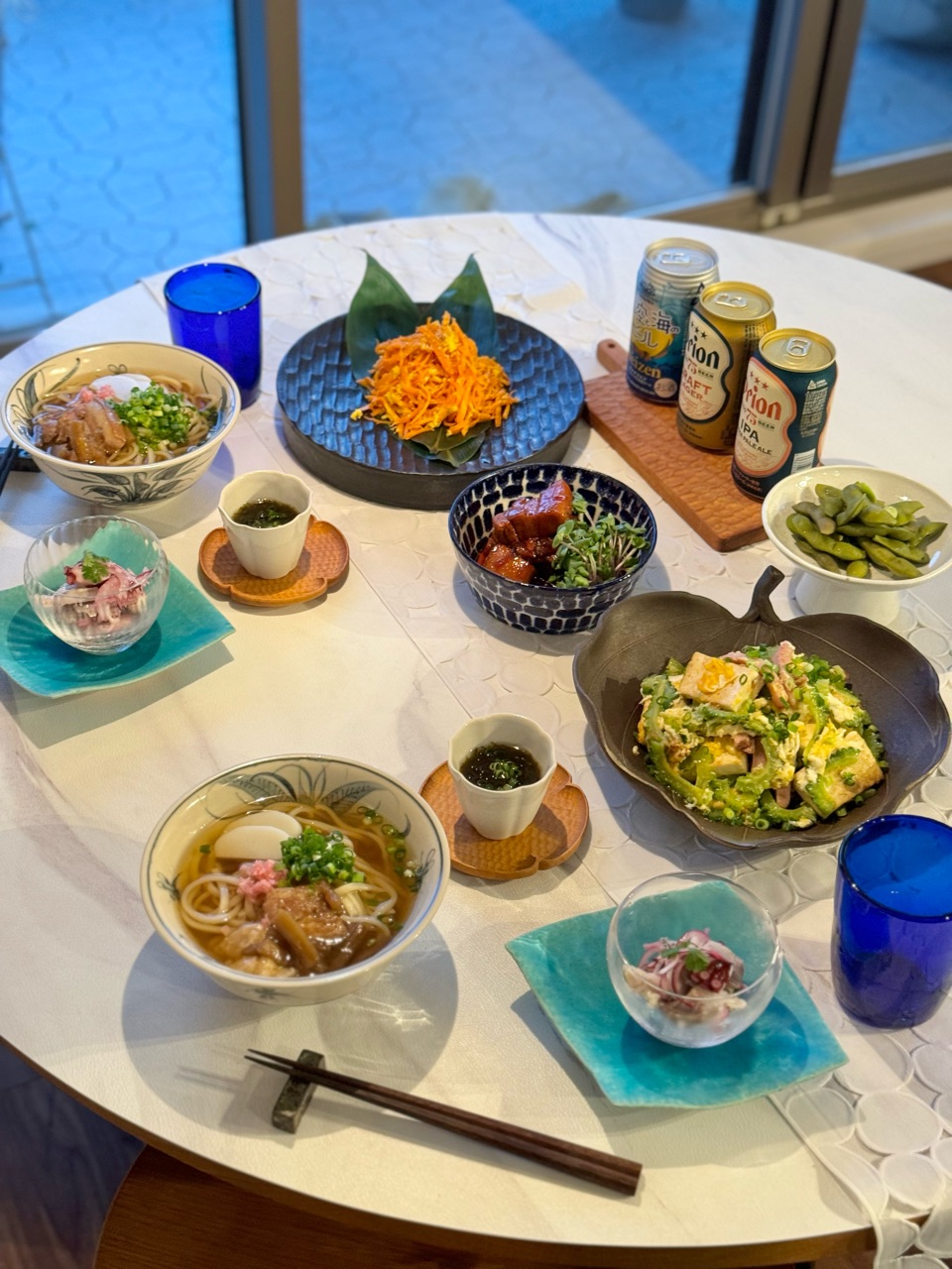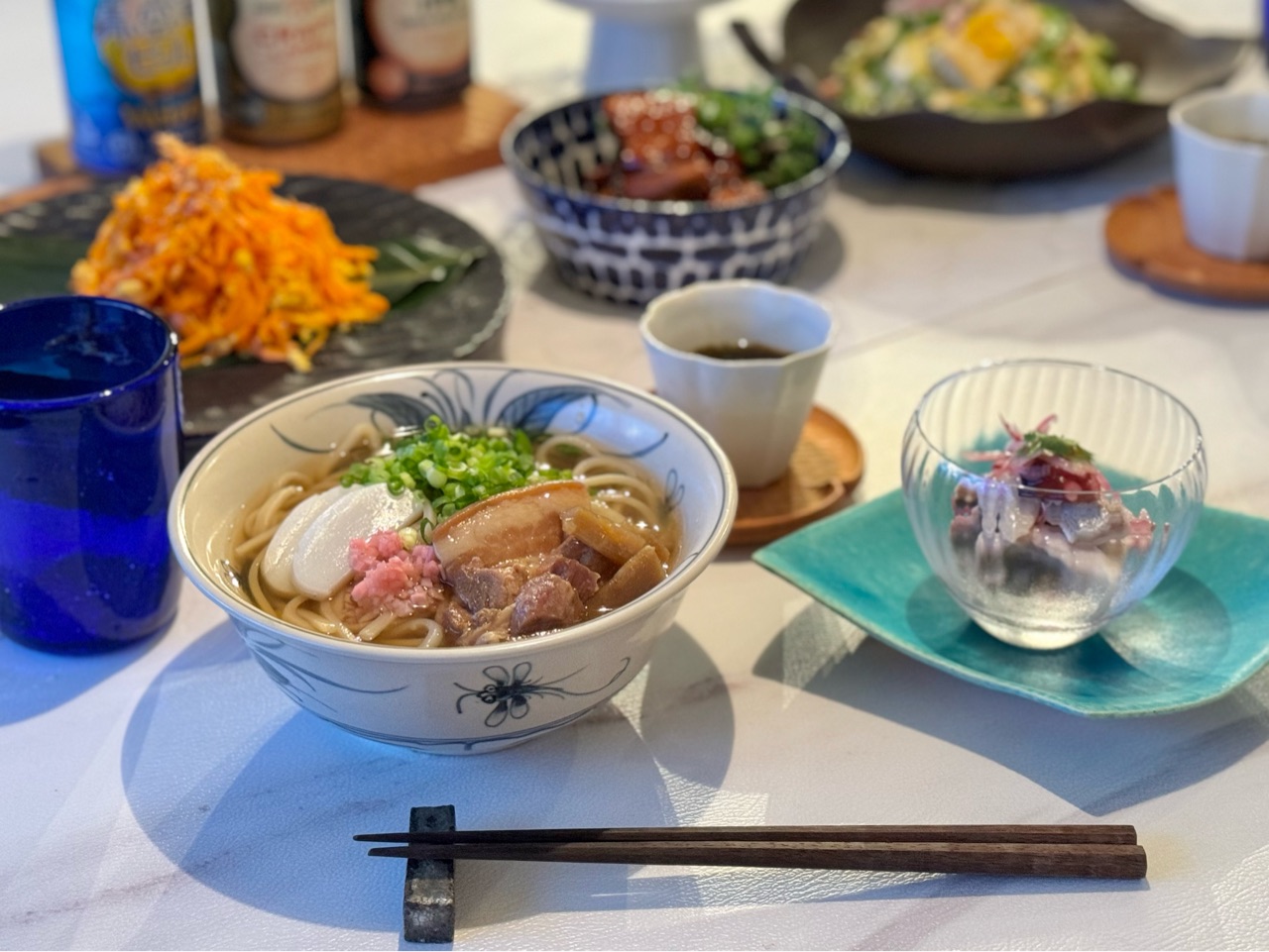 青いグラスは沖縄で買ってきた琉球グラスです。