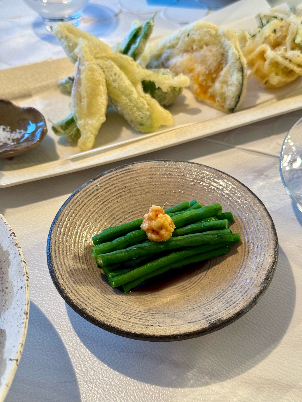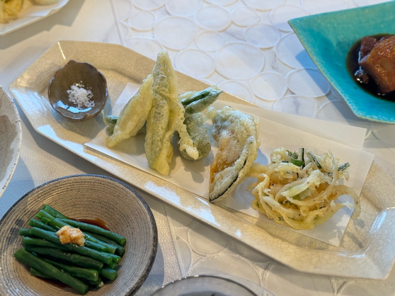 かぼちゃ、オクラ、甘長ししとう、茗荷、かき揚げです。