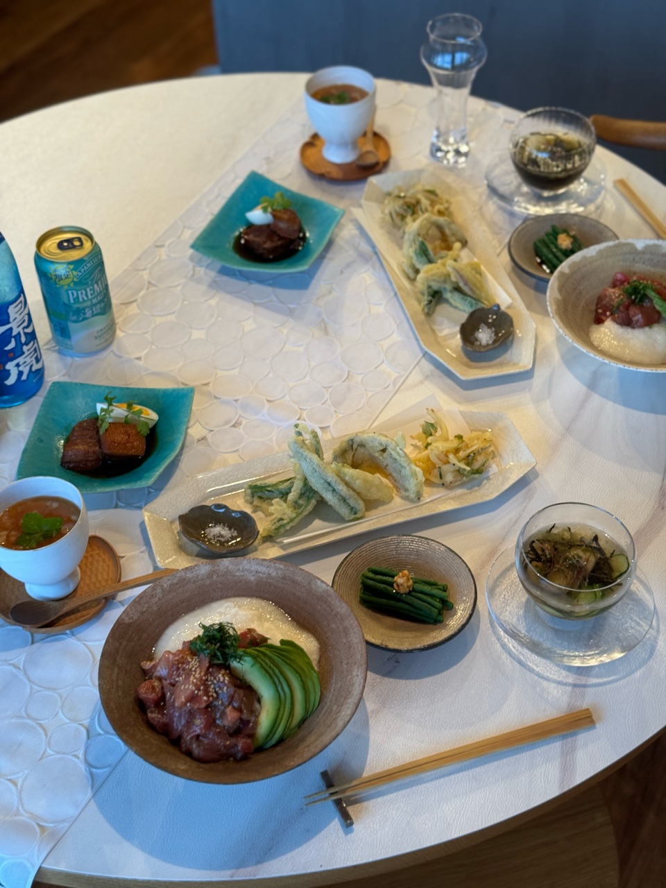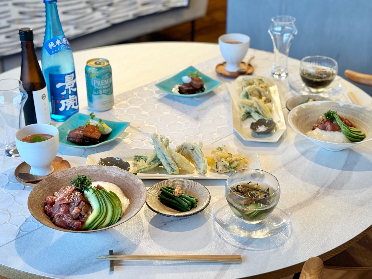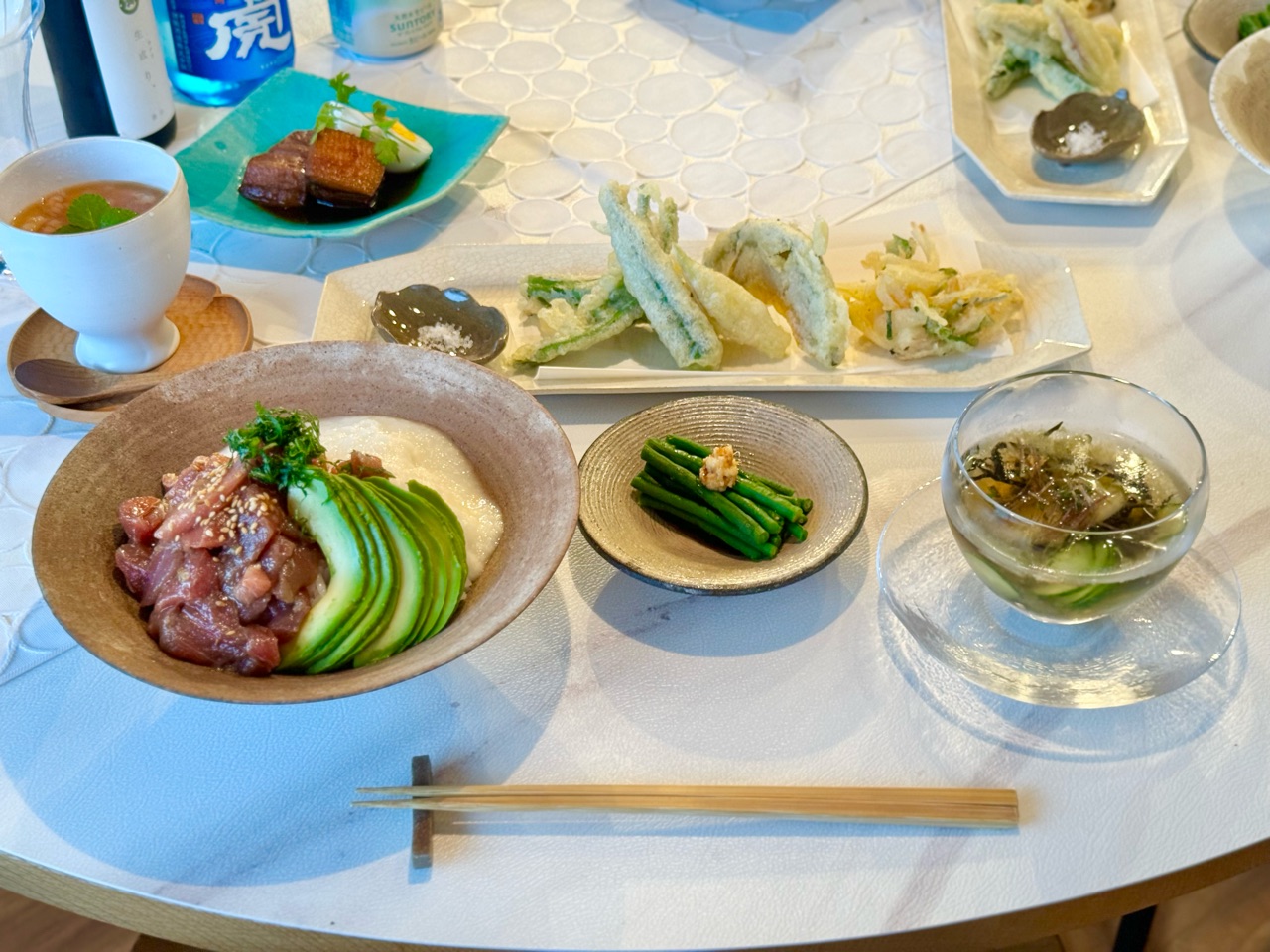今夜はまぐろの漬けと天ぷらなど並べました♪
