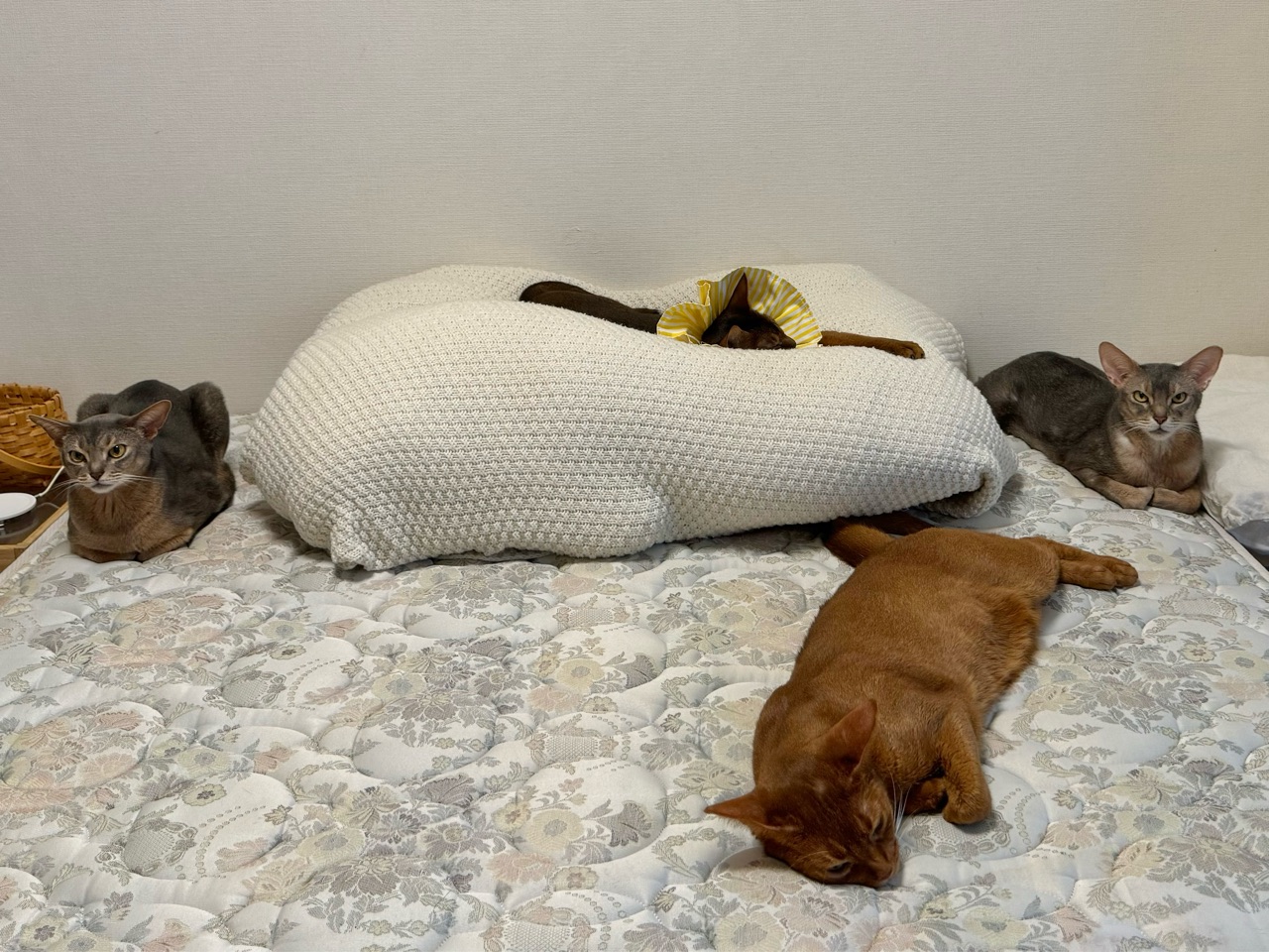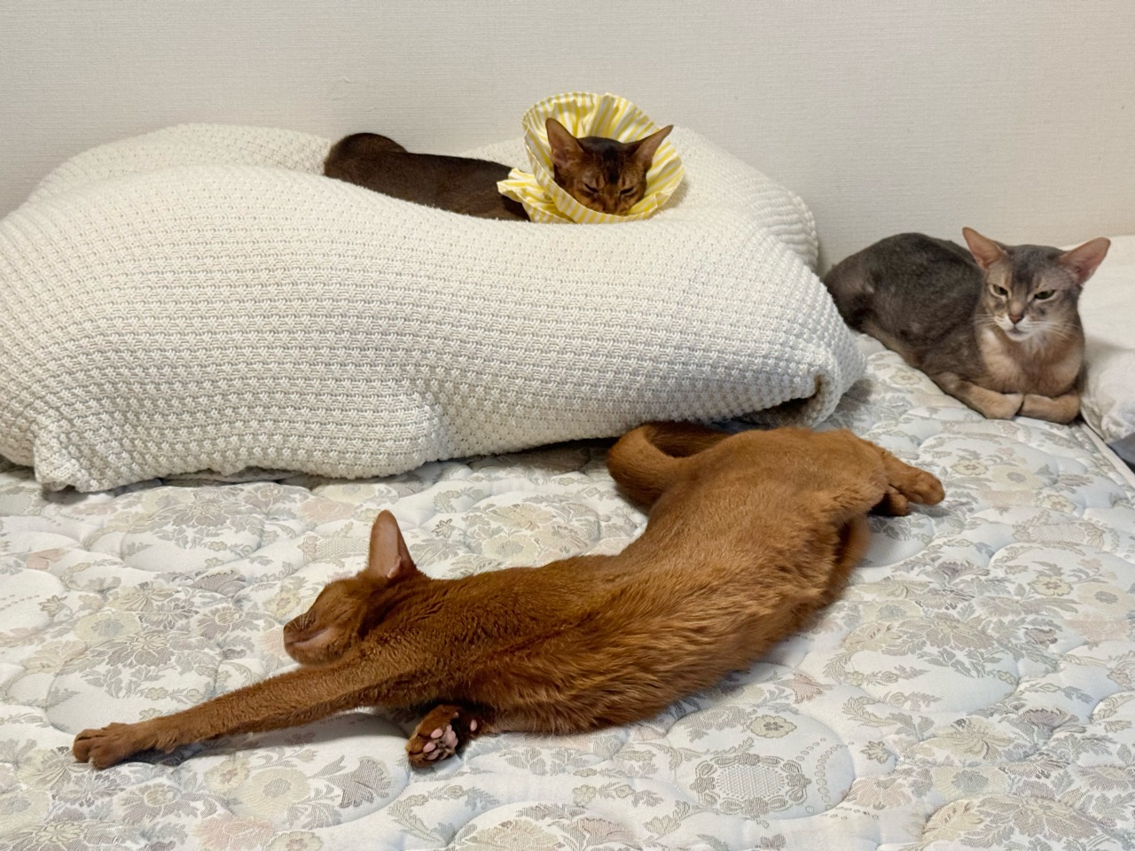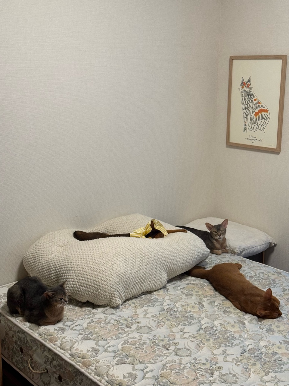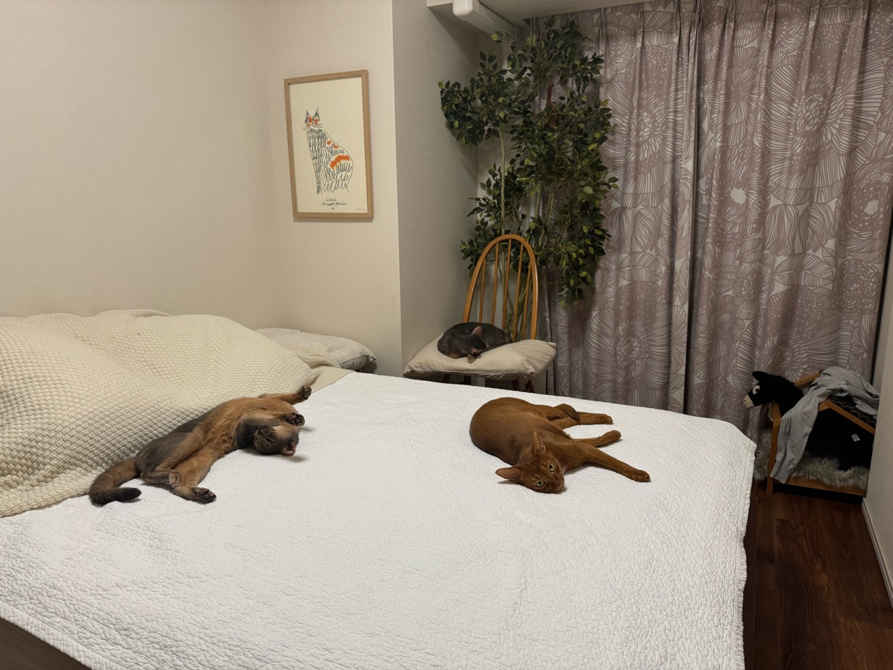 猫たち、エアコンの部屋にいることもあれば、北側の寝室にいることもあります。