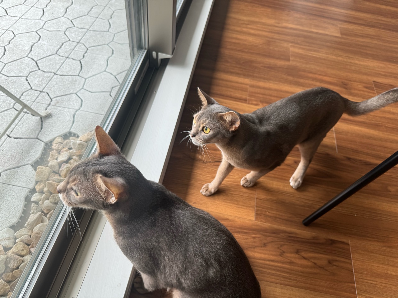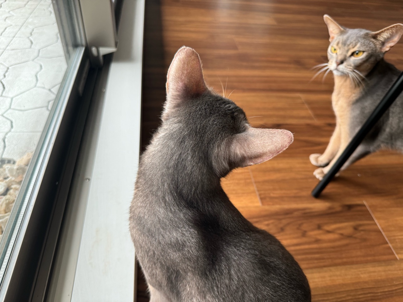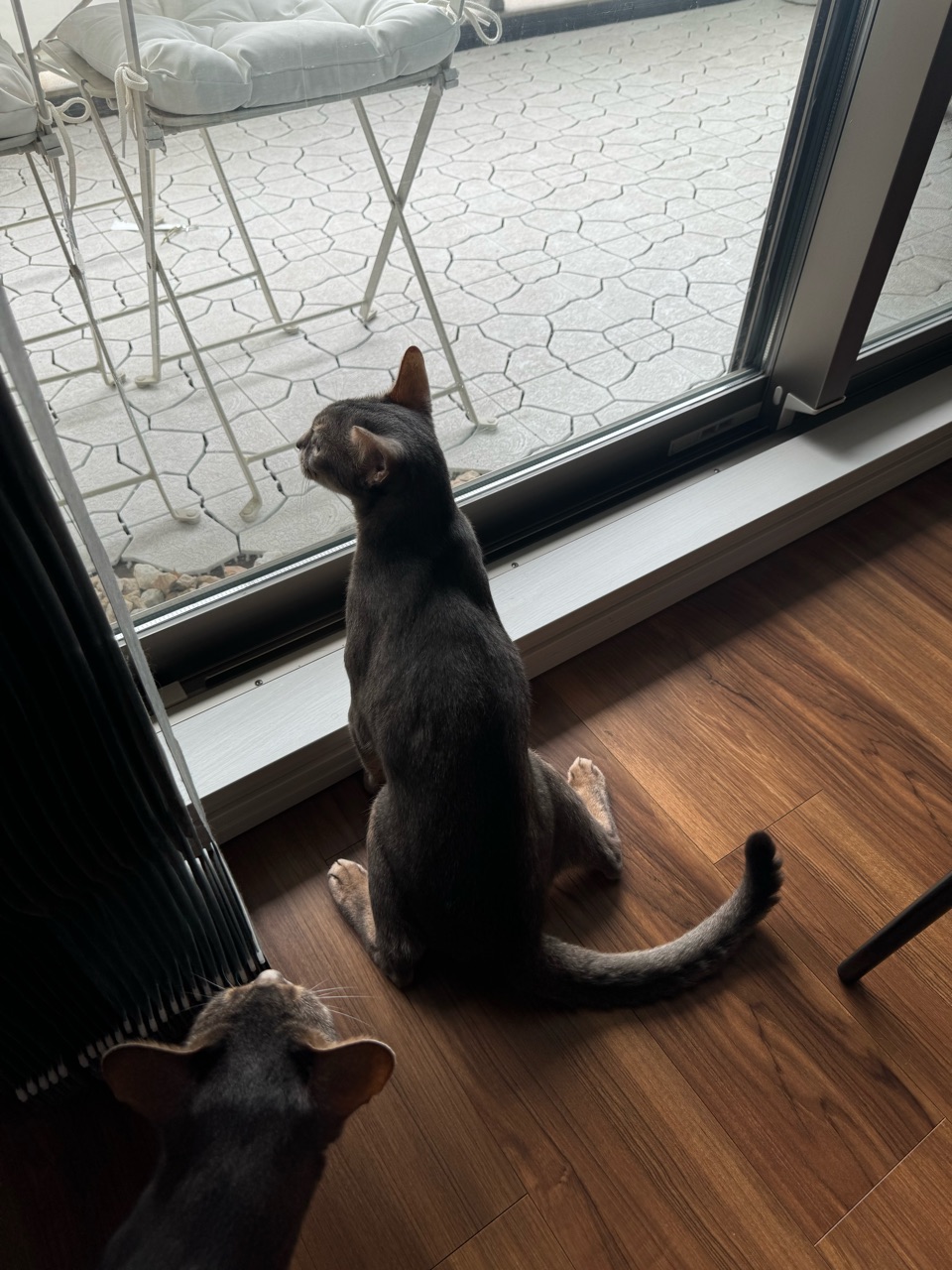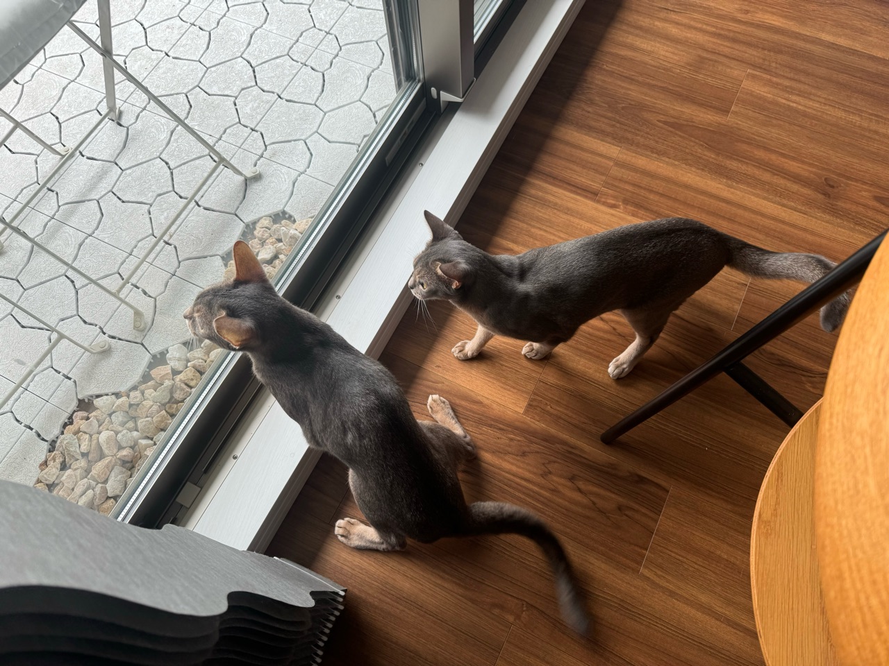 窓の外にやってくるスズメさんを見つけるや、窓際に走ってきた何やらウニャウニャ言ってる?