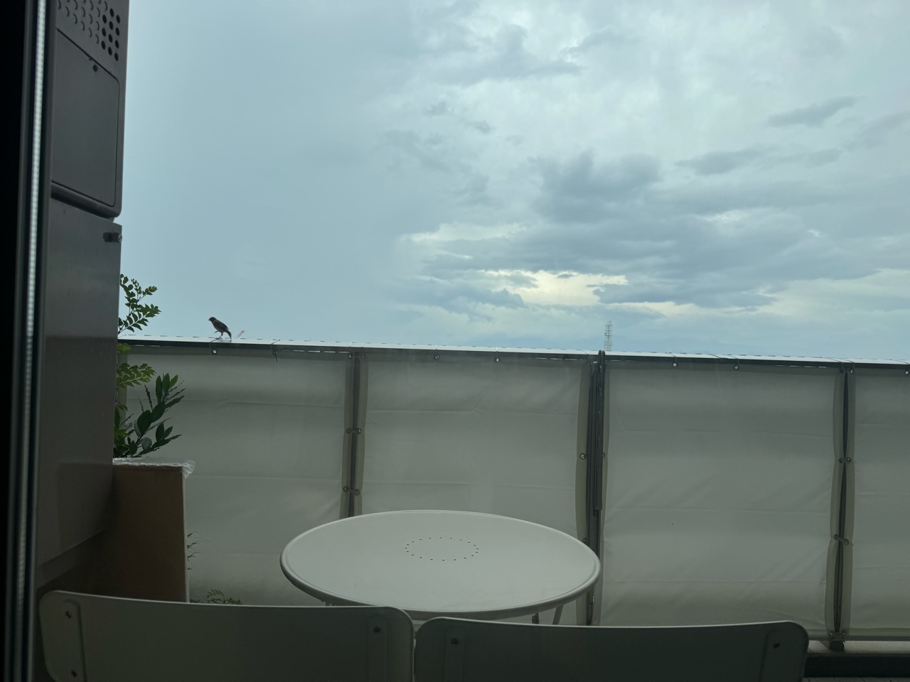 ベランダの手すりに、スズメさんが遊びに来てた。