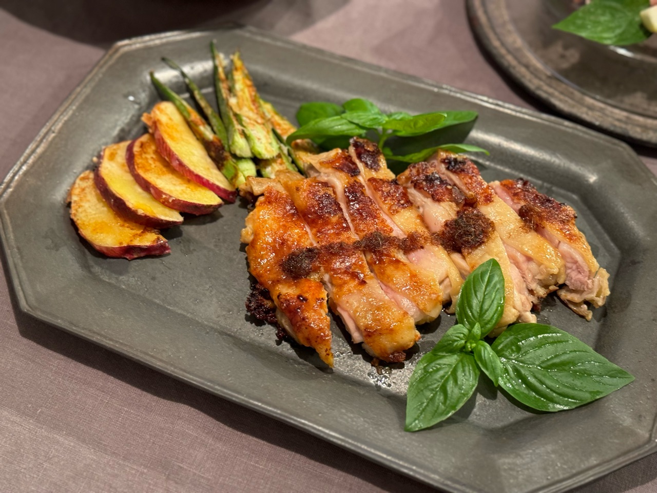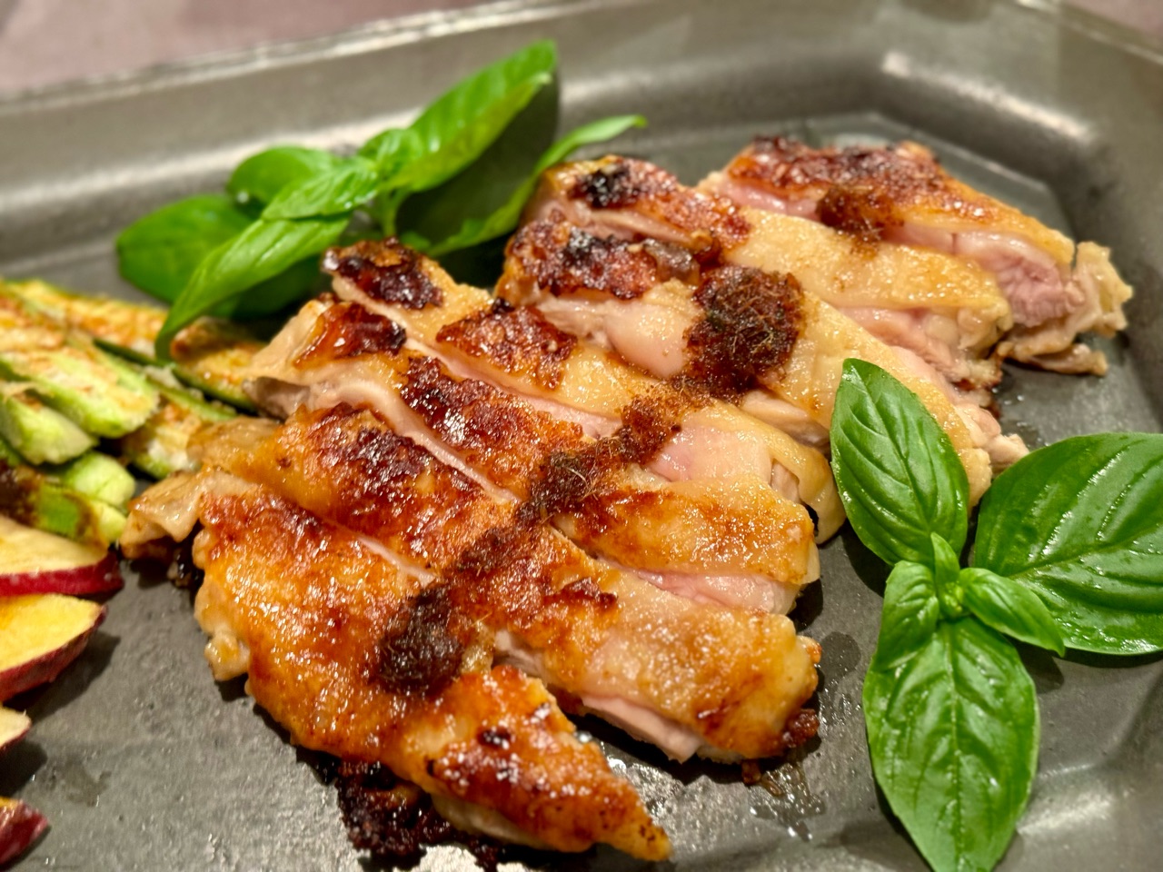 鶏もも肉をニンニク麹に漬けて、生パルメザンチーズをまぶしつけて焼いてあります。