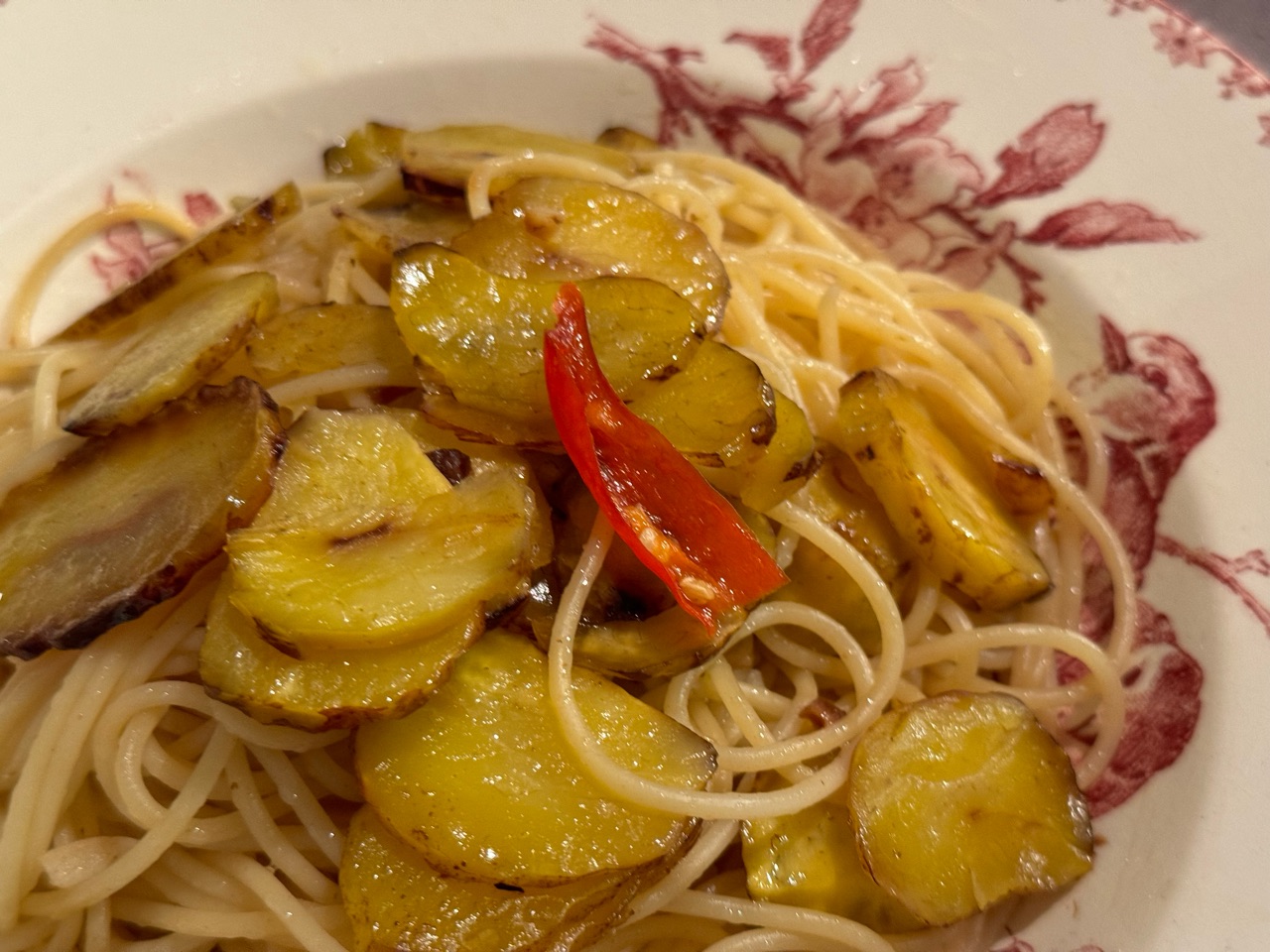 栗のペペロンチーノは、普通にペペロンチーノを作る要領で、生栗のスライスを入れるだけです。