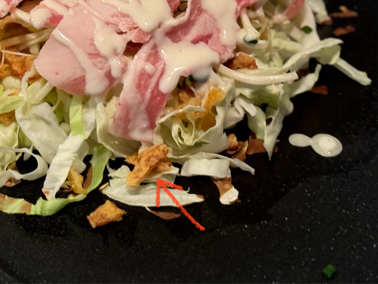お好み焼きが1枚しか焼けなかったので、残ったキャベツやお肉を使って、フライパンで焼きそばを作って相盛りにしました。