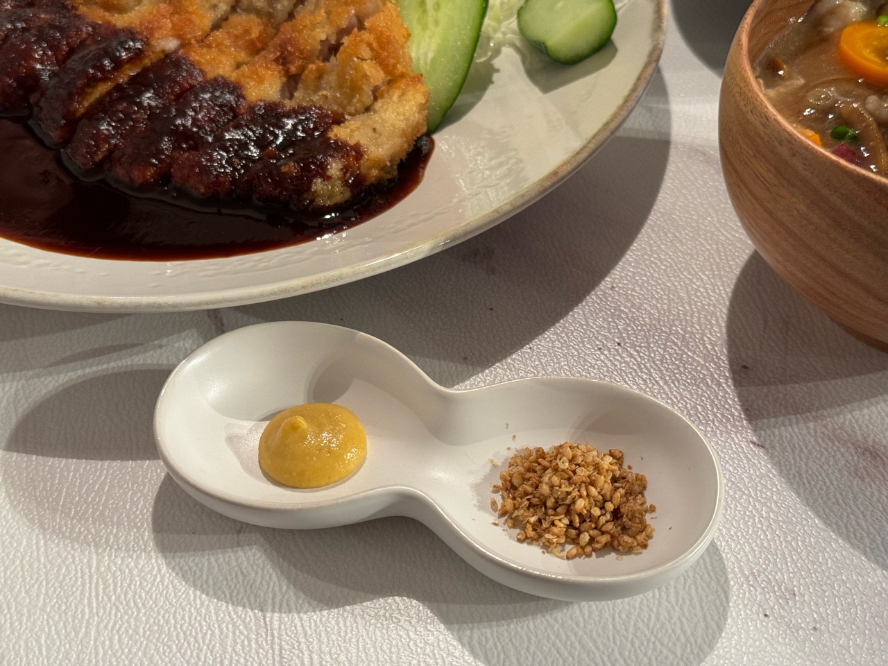 ロースカツに、熱々の味噌ダレをたっぷりかけます。