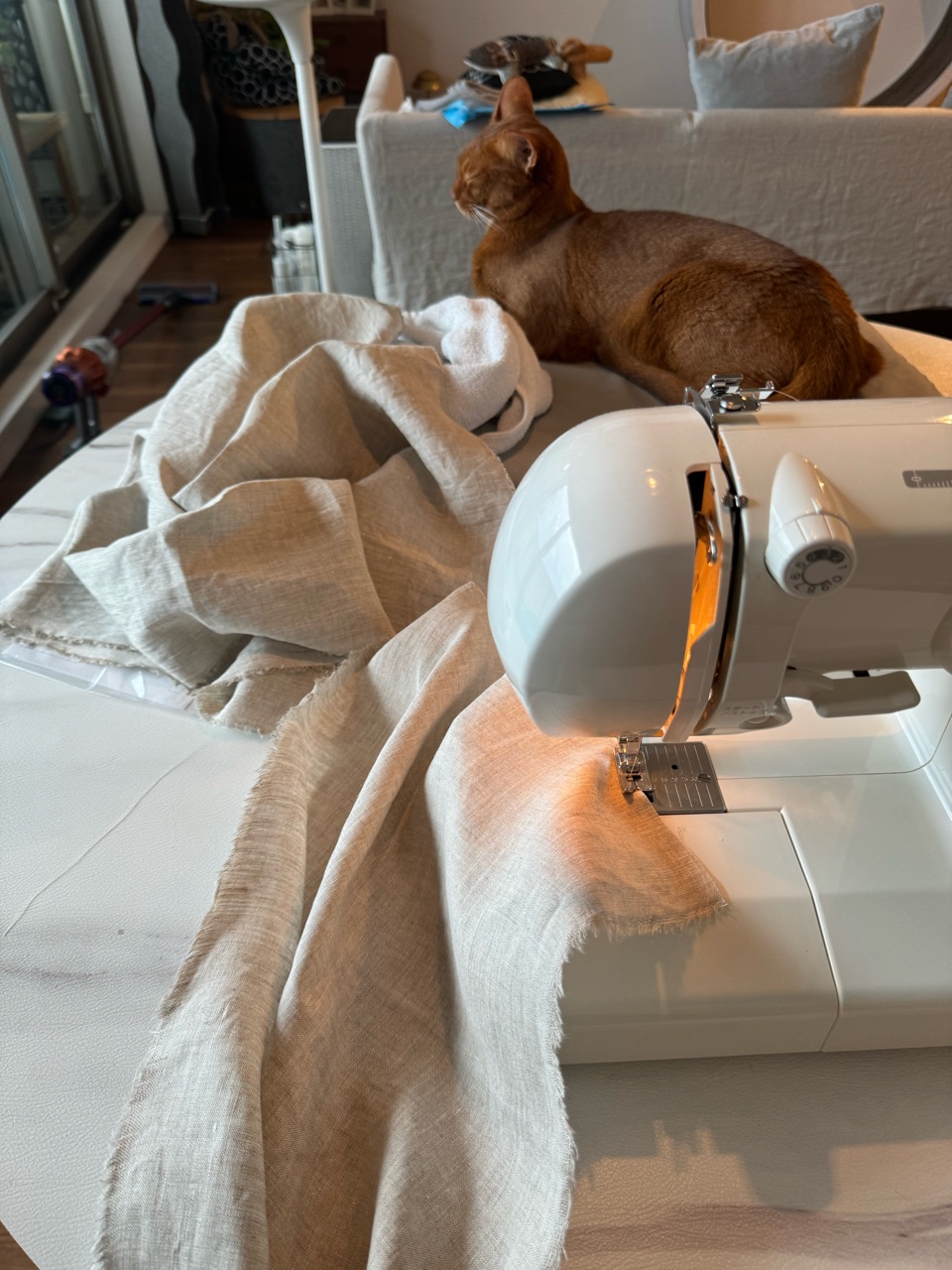 柔らかめのリネンで作ったんですけど、床に広げた生地はちょっとしたことで歪むし、立ったり座ったりの作業も多くて、測って切るだけで大変でしたー(涙)
