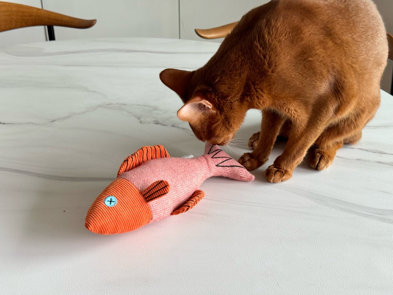 猫たちの爪研ぎと、魚の蹴りぐるみ。