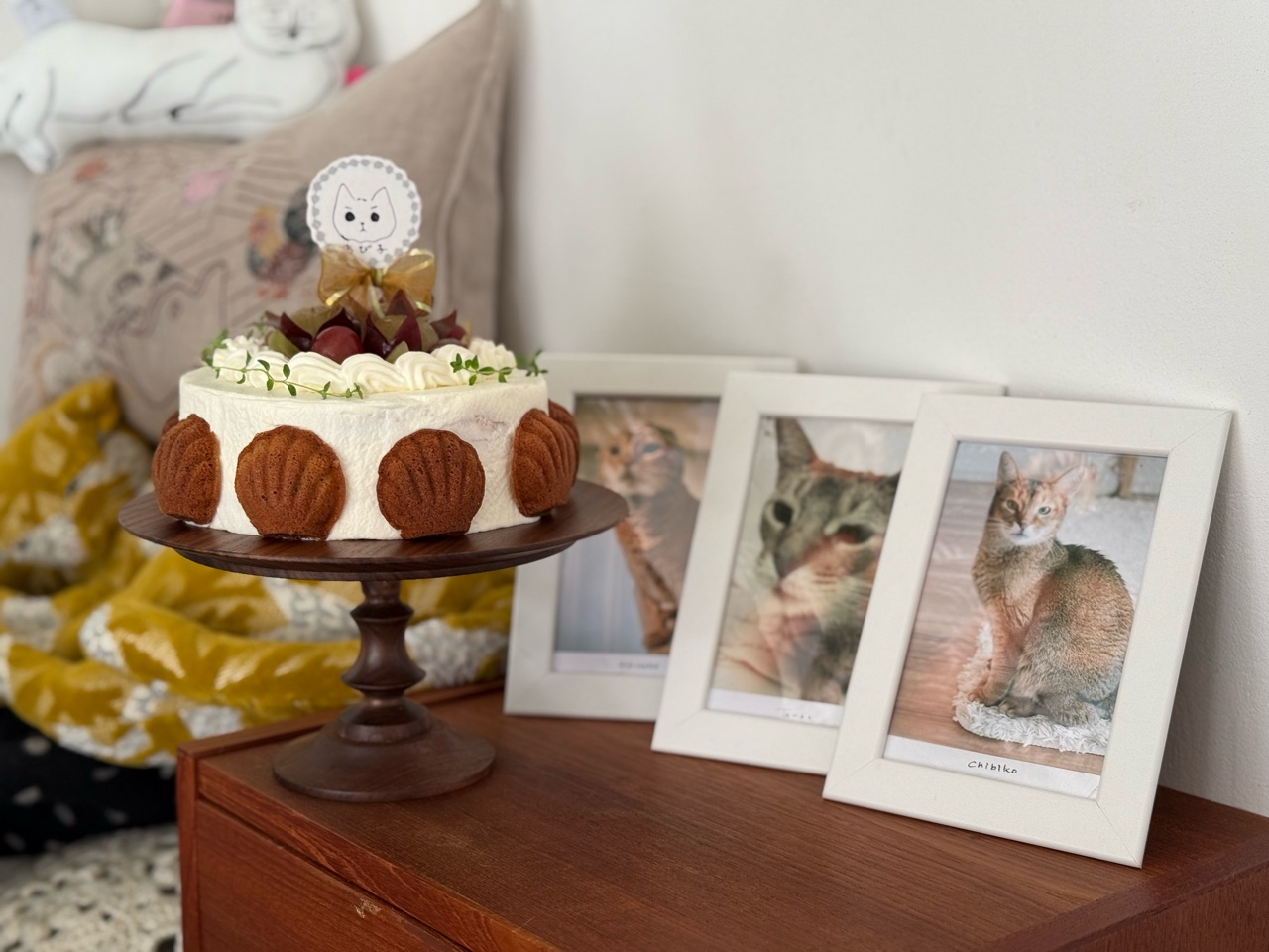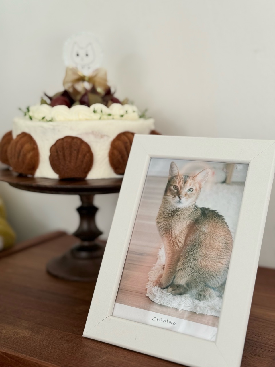 2024年10月06日 ちび子のケーキ ちび子な命日に、ちび子のケーキを焼きました。明日はお誕生日だから、お誕生日ケーキの前倒しでもあるよ♪この時期は、ちび子の好きなクリームのケーキに合うフルーツがあまりなくて困るんだけど、昨日ご近所さんからピオーネをいただいたので、ぶどうのケーキにしました♪ミニマドレーヌも周りに貼ってクラシカルな雰囲気にしてあります。ちび子プレート付き✨リボンも付いてる🎀ちび子がお散歩したベランダで育ててハーブも飾って、ちび子すぺしゃるケーキだよ/•᷅•᷄\୭✨✨✨ちび子、クリームたっぷり食べてね♪パパ、ママ、お空のお友達たちと仲良くみんニャで食べてね。ちび子、お空でまた抱っこできる日を楽しみにしているよ♪そっちでも、クリームのケーキ作るからね🍰楽しみだね✨ 「├ ちび子」カテゴリの最新記事 < 前の記事次の記事 > コメント コメント一覧 (2) 1. origanum 2024年10月06日 23:15 ちびたん💓ってお転婆だったり、パパママの側で抱き上げてもらうのをじっと待ったり、ふわふわ妖精さんだったり訳知りのベテランさんだったり、甘えん坊だったり面倒見が良かったり、可愛くて頼れる猫さんでしたねー🫠 0 jolijolidayo がしました 2. ビビアン 2024年10月07日 06:19 意思の強そうなちび子ちゃんのイラスト、可愛い〜♥ 良い色(りすたん色かな😉)のマドレーヌだけでもすごいのに、クリームたっぷりできれいなデコレーションのケーキ、ちび子ちゃんへの愛情が伝わります😂 お空でちび子ちゃんの隣でひなちゃんが小躍りしてそう🤭 0 jolijolidayo がしました コメントフォーム 名前 コメント 記事の評価 リセット リセット 顔 星 情報を記憶 コメントを投稿する